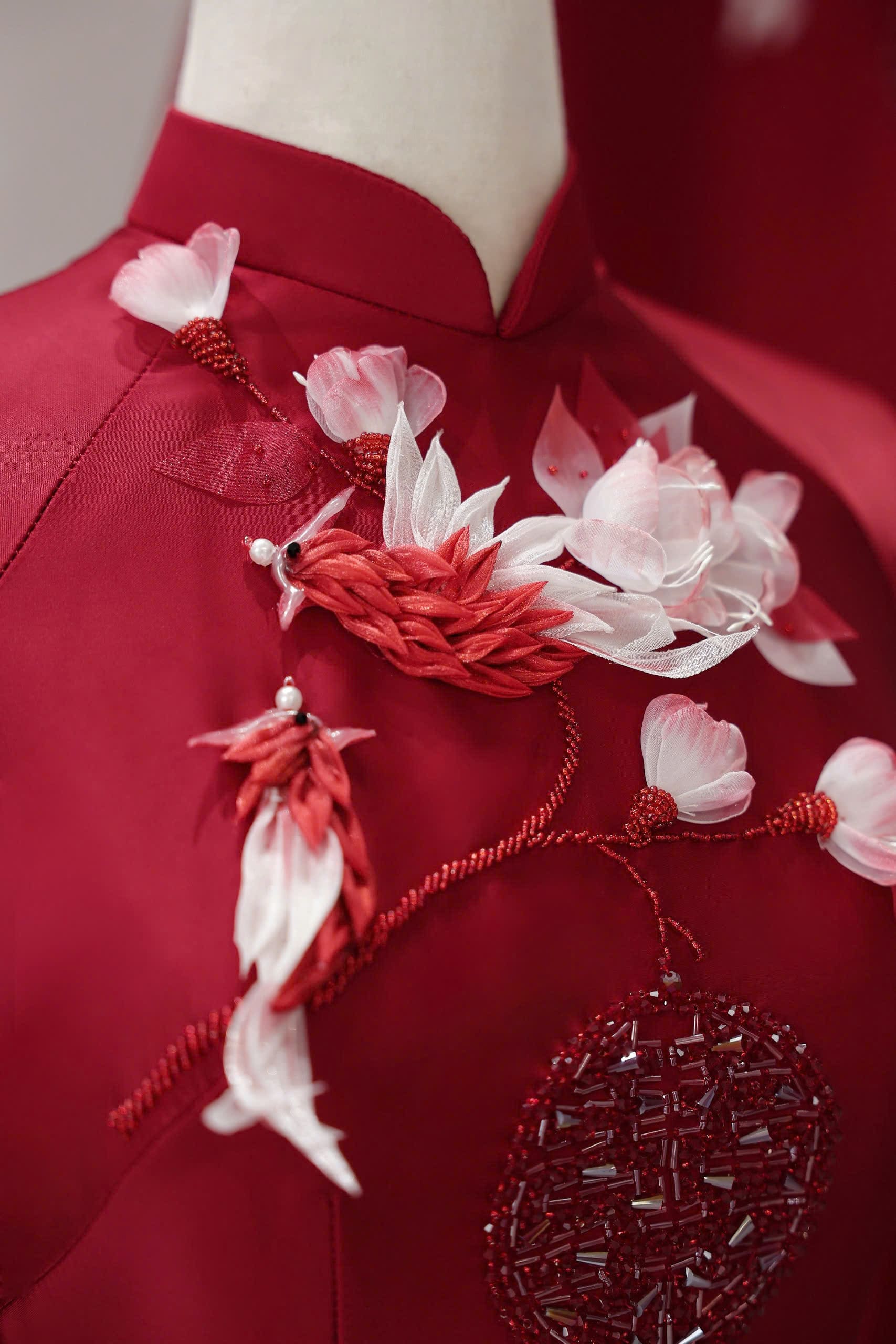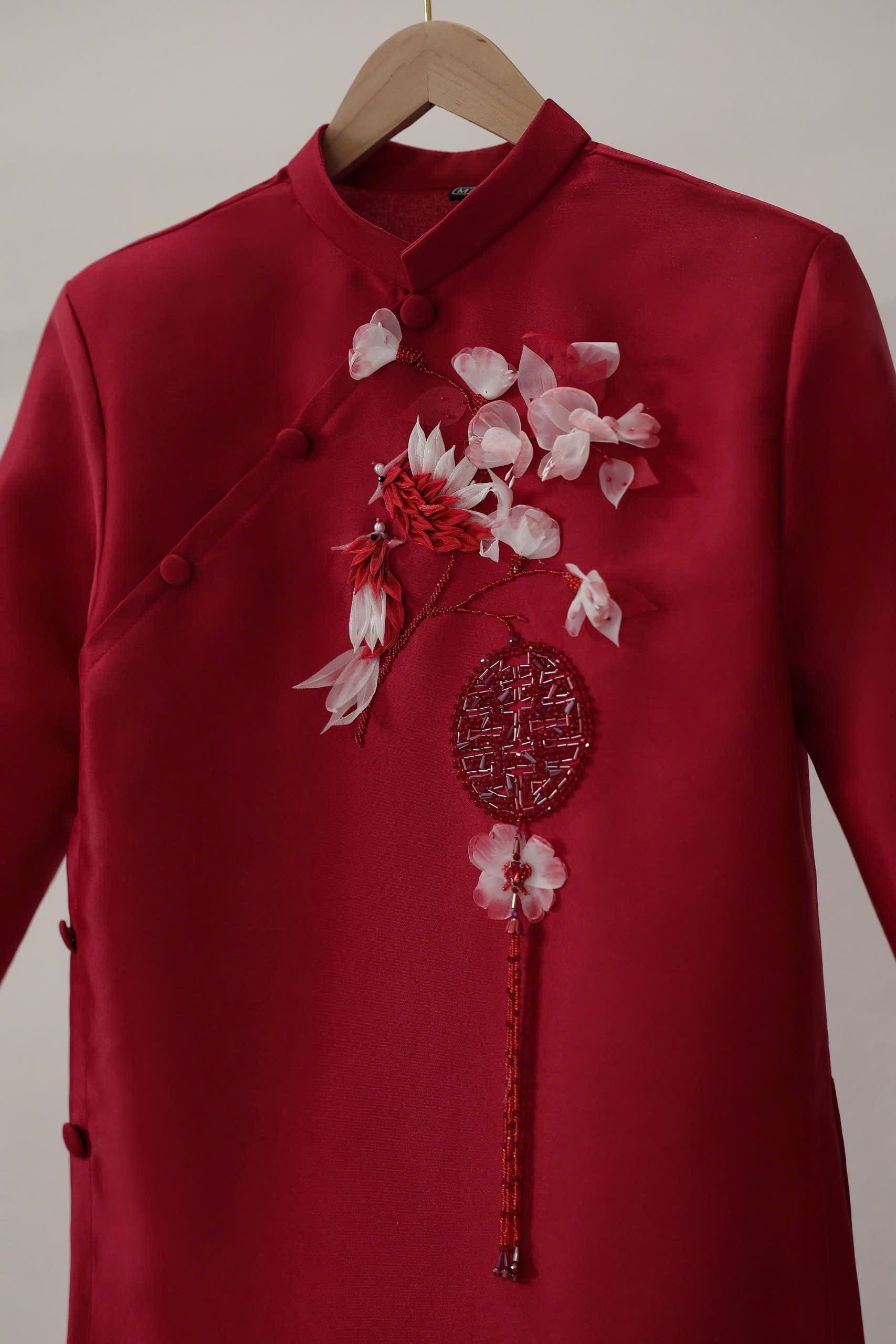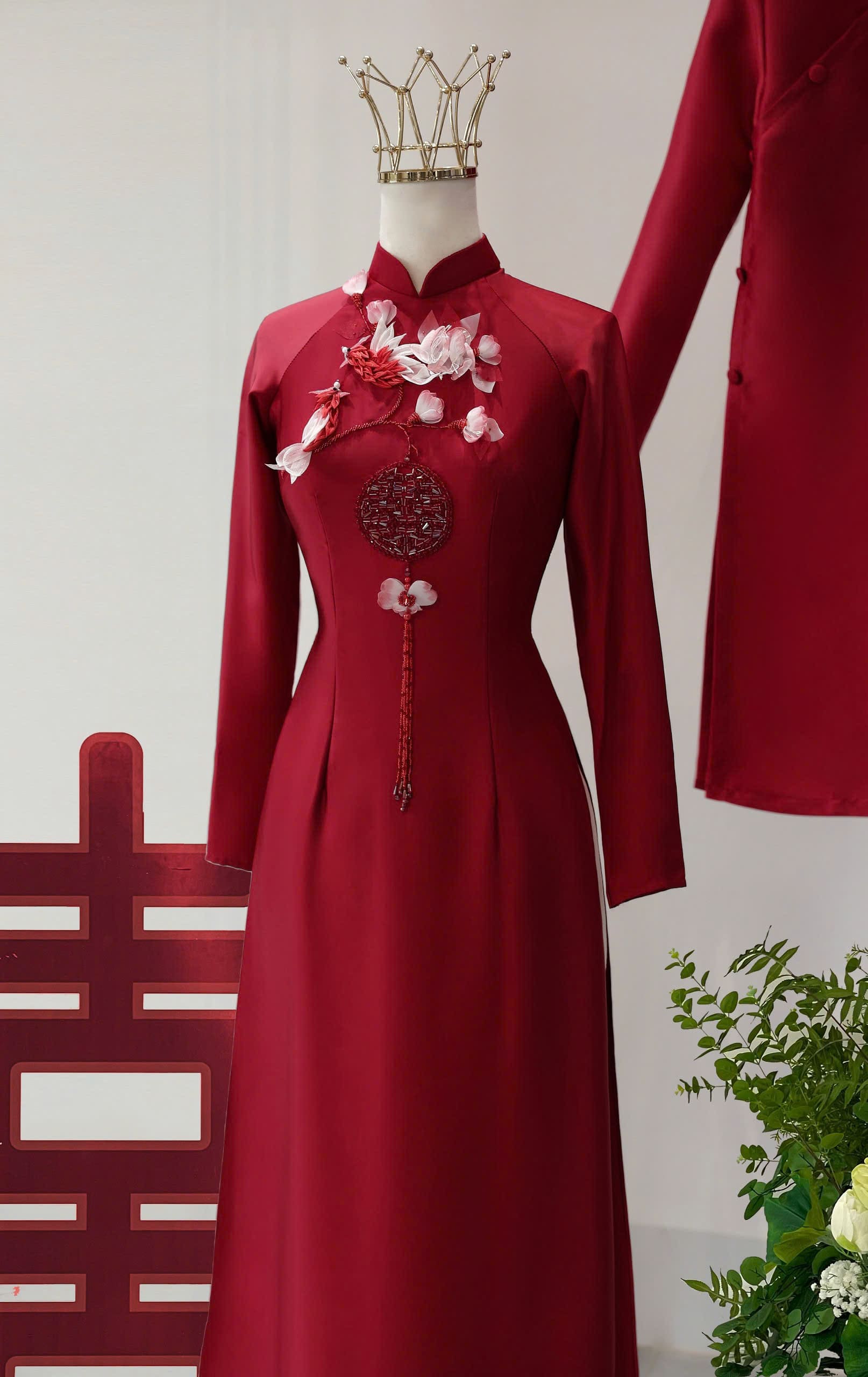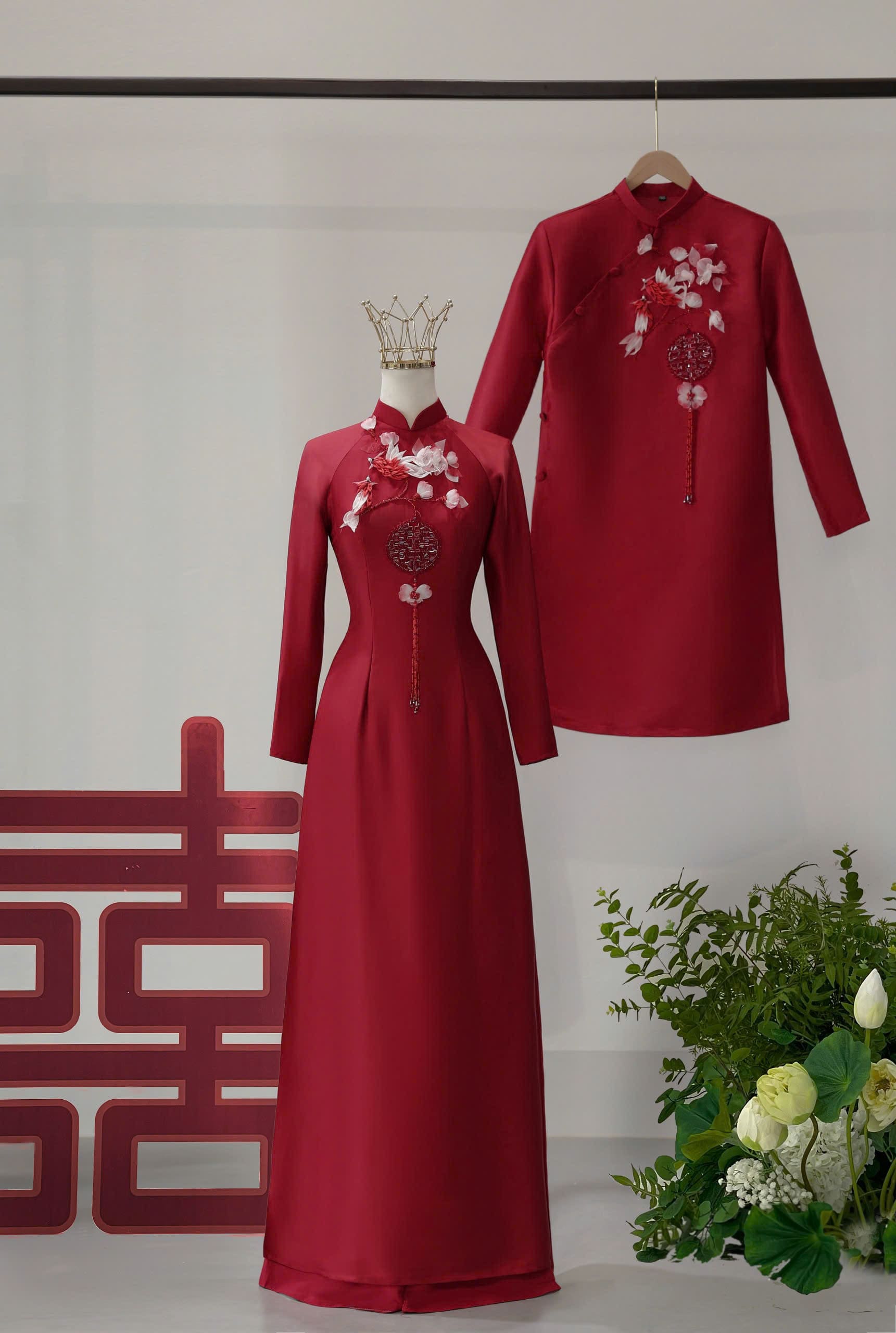 ÁO DÀI CƯỚI CẶP ĐÔI KẾT CHIM UYÊN ƯƠNG TONE ĐỎ SANG TRỌNG