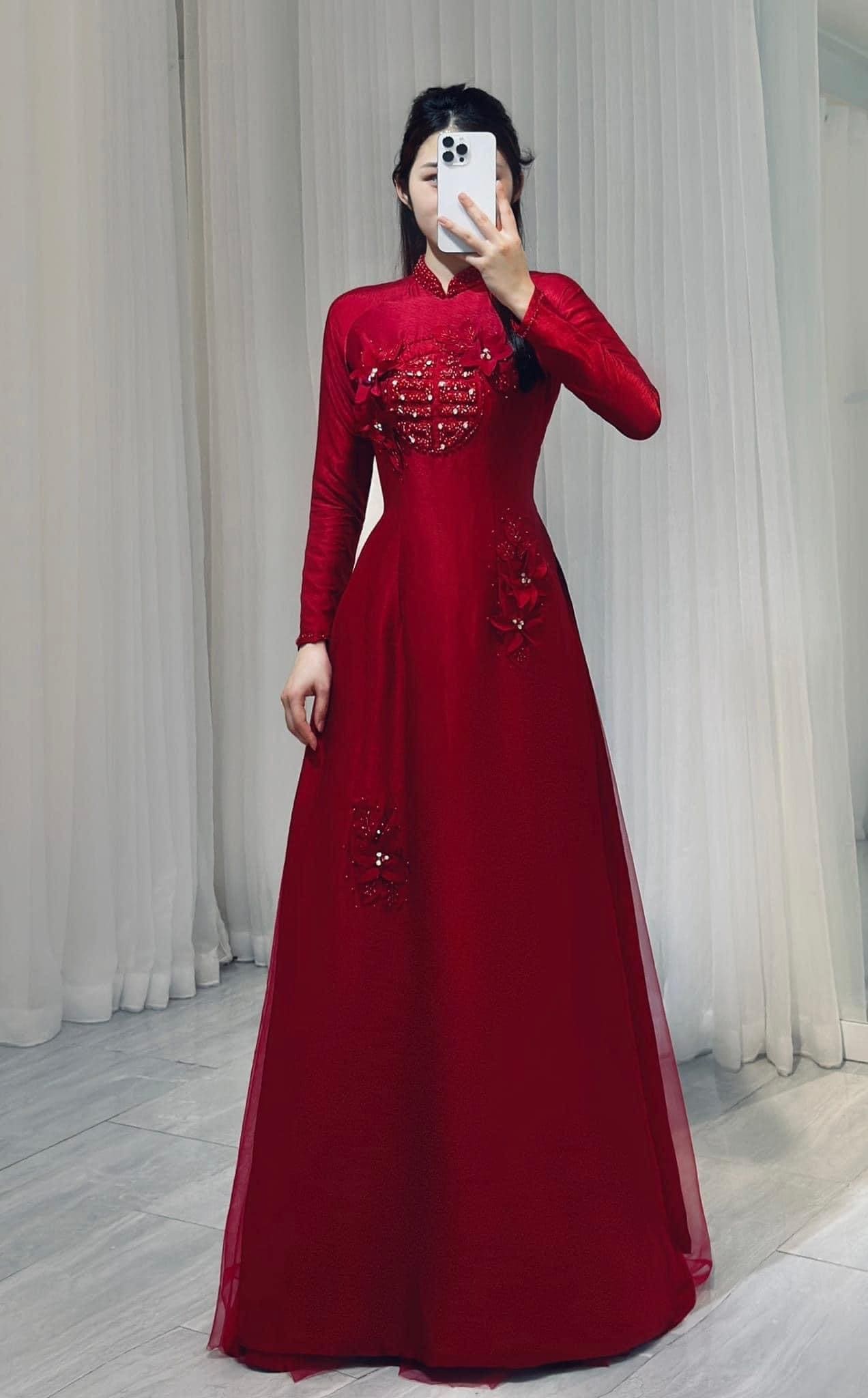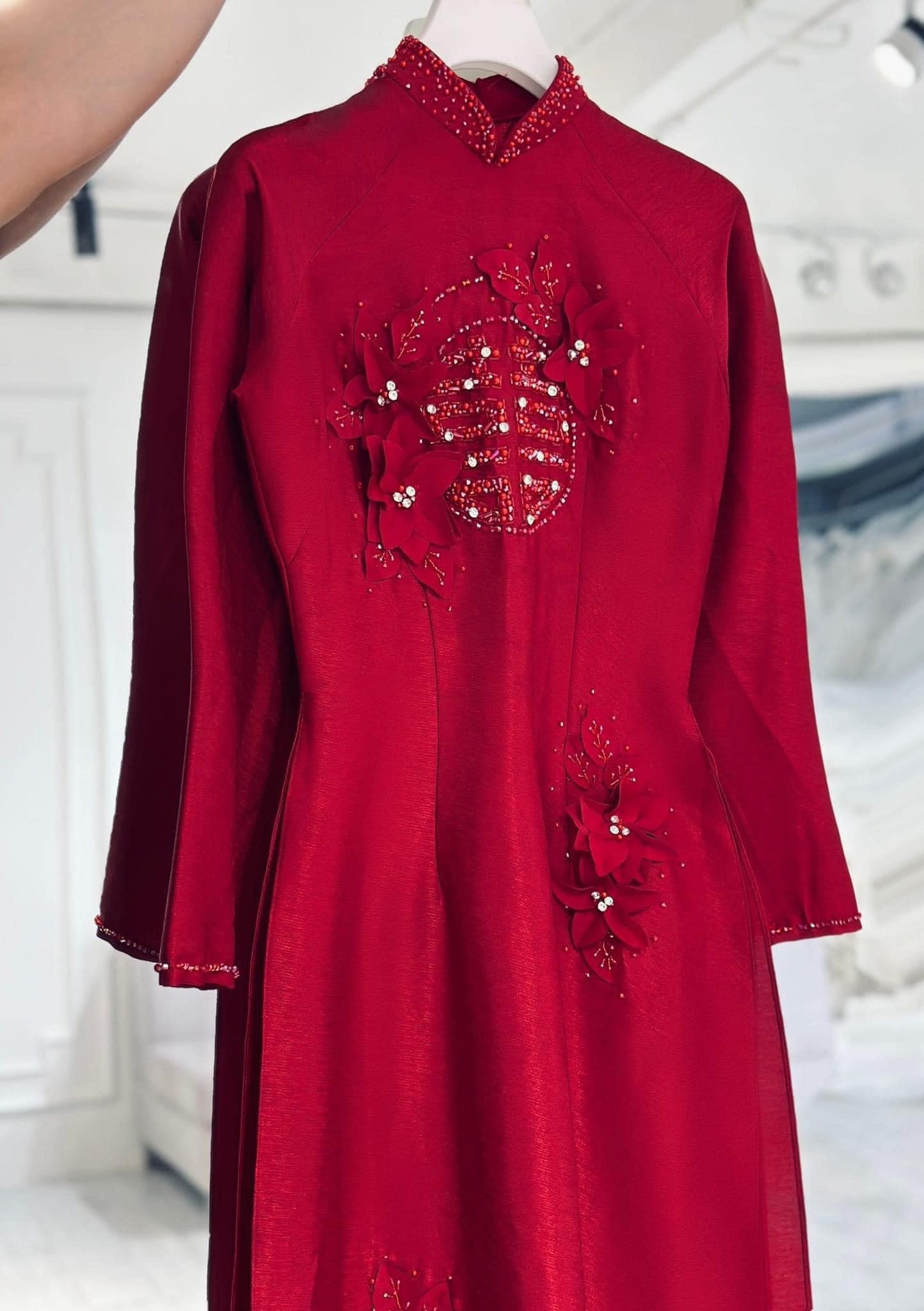 ÁO DÀI CƯỚI CÔ DÂU THÊU HOA KẾT CHỮ HỶ