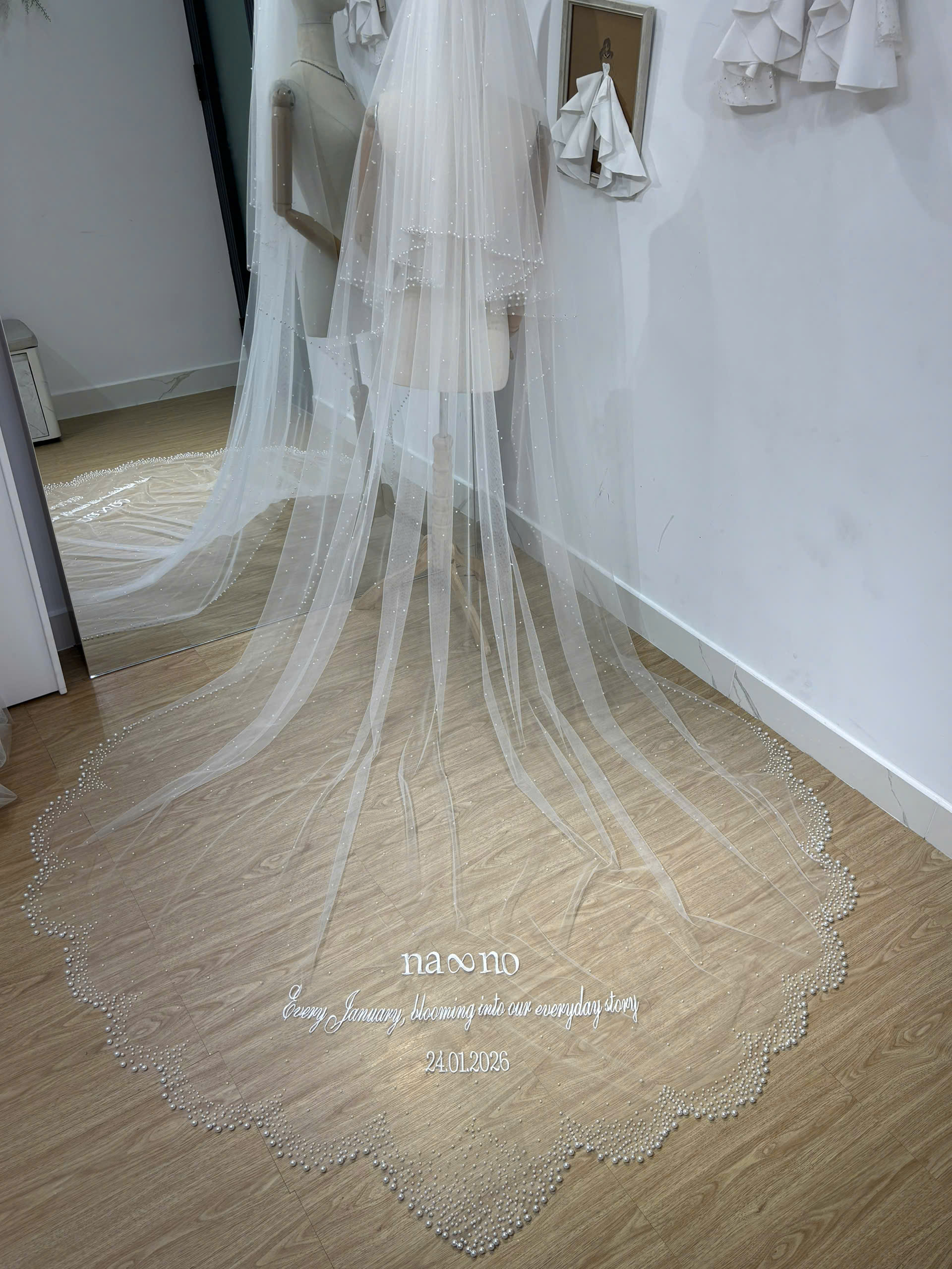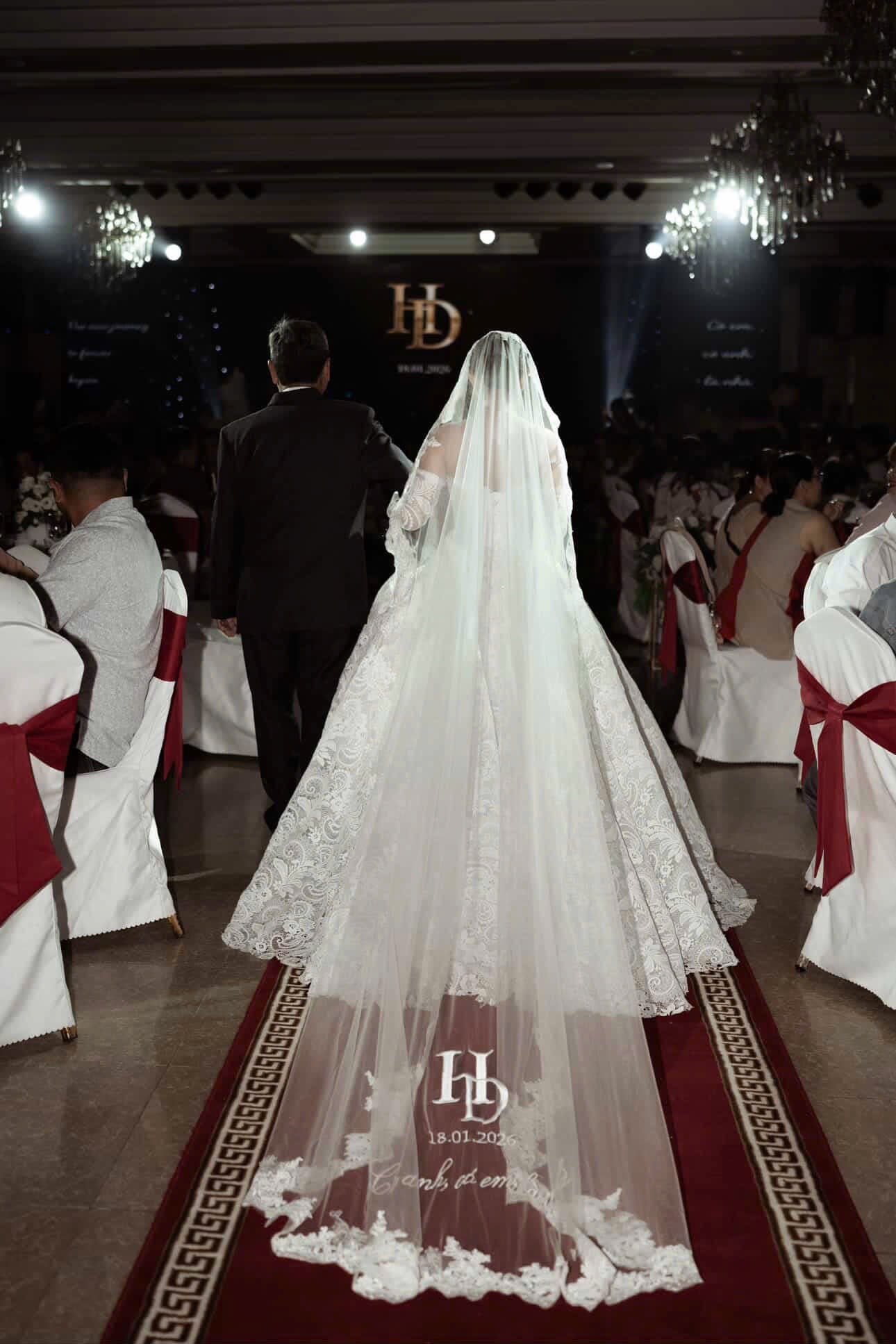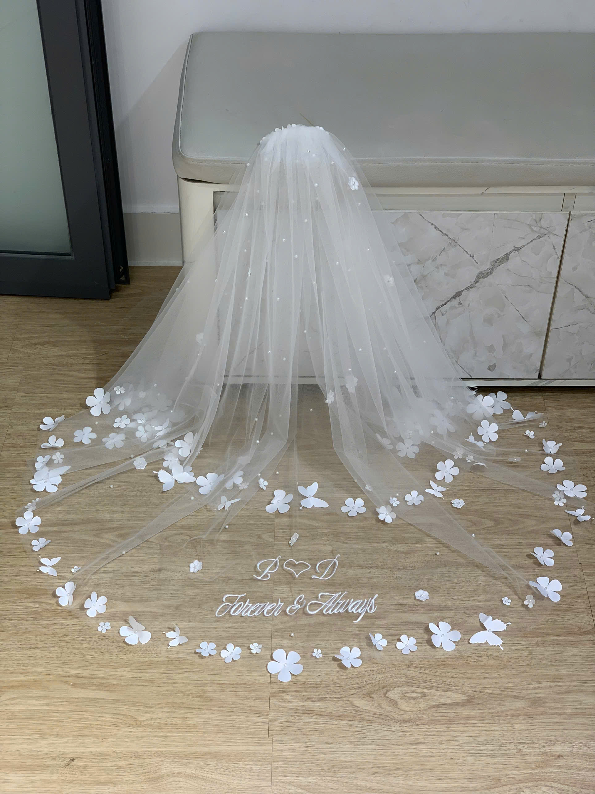 Voan cưới chạm sàn mang đến vẻ đẹp lộng lẫy, sang trọng và đầy ấn tượng. Đây là kiểu voan phổ biến trong các đám cưới trang trọng, giúp cô dâu nổi bật khi bước vào lễ đường.