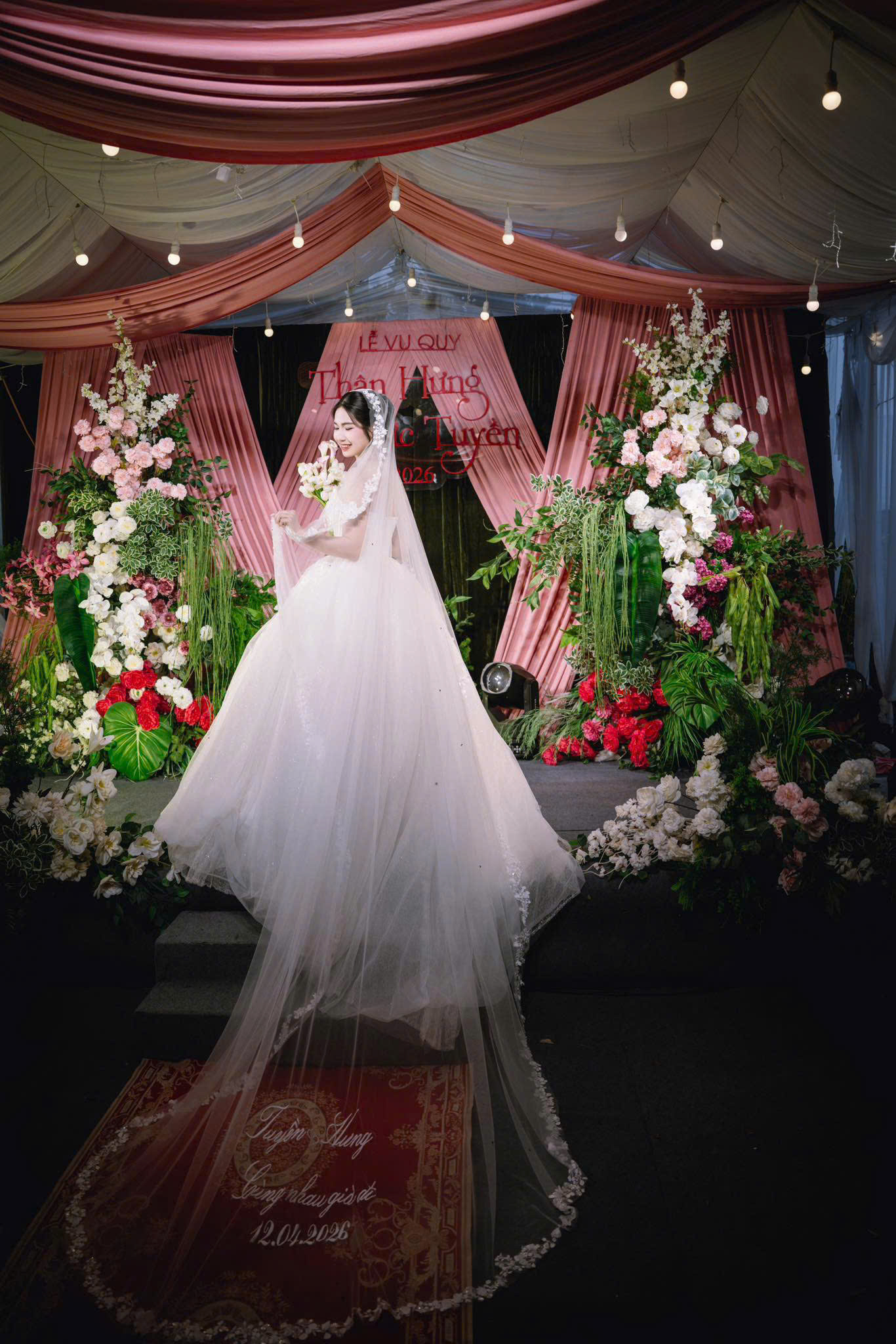 - Váy đuôi dài → voan dài thêu chữ cực kỳ ấn tượng