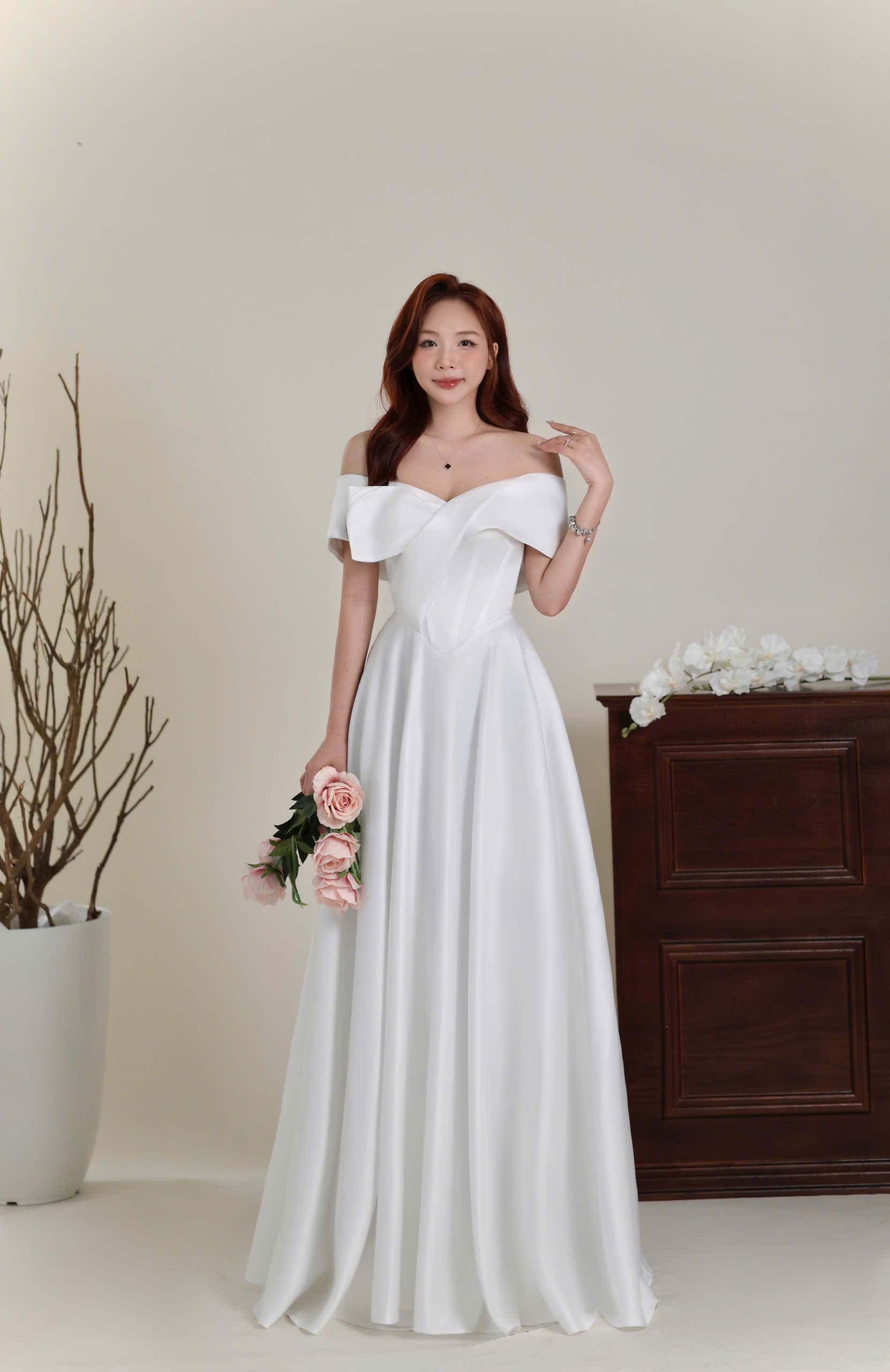3. VÁY CƯỚI FORM CHỮ A KIỂU TRỄ VAI ĐƠN GIẢN