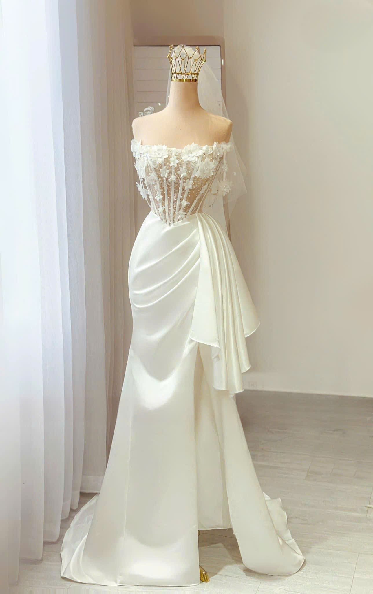 Chiếc váy cưới cúp ngực này mang theo nét thanh lịch bên trong ngoại hình mảnh khảnh từ đó giúp tạo nên chiếc váy quyến rũ trong ngày trọng đại. Đơn giản với chiếc váy đuôi cá trắng trơn thanh lịch điểm xuyến phần tay trễ kèm theo những đóa hoa đang hé rộ khắp phần trên váy cưới. Bạn sẽ thật xinh đẹp trong bộ váy xuất sắc của Kira Bridal.