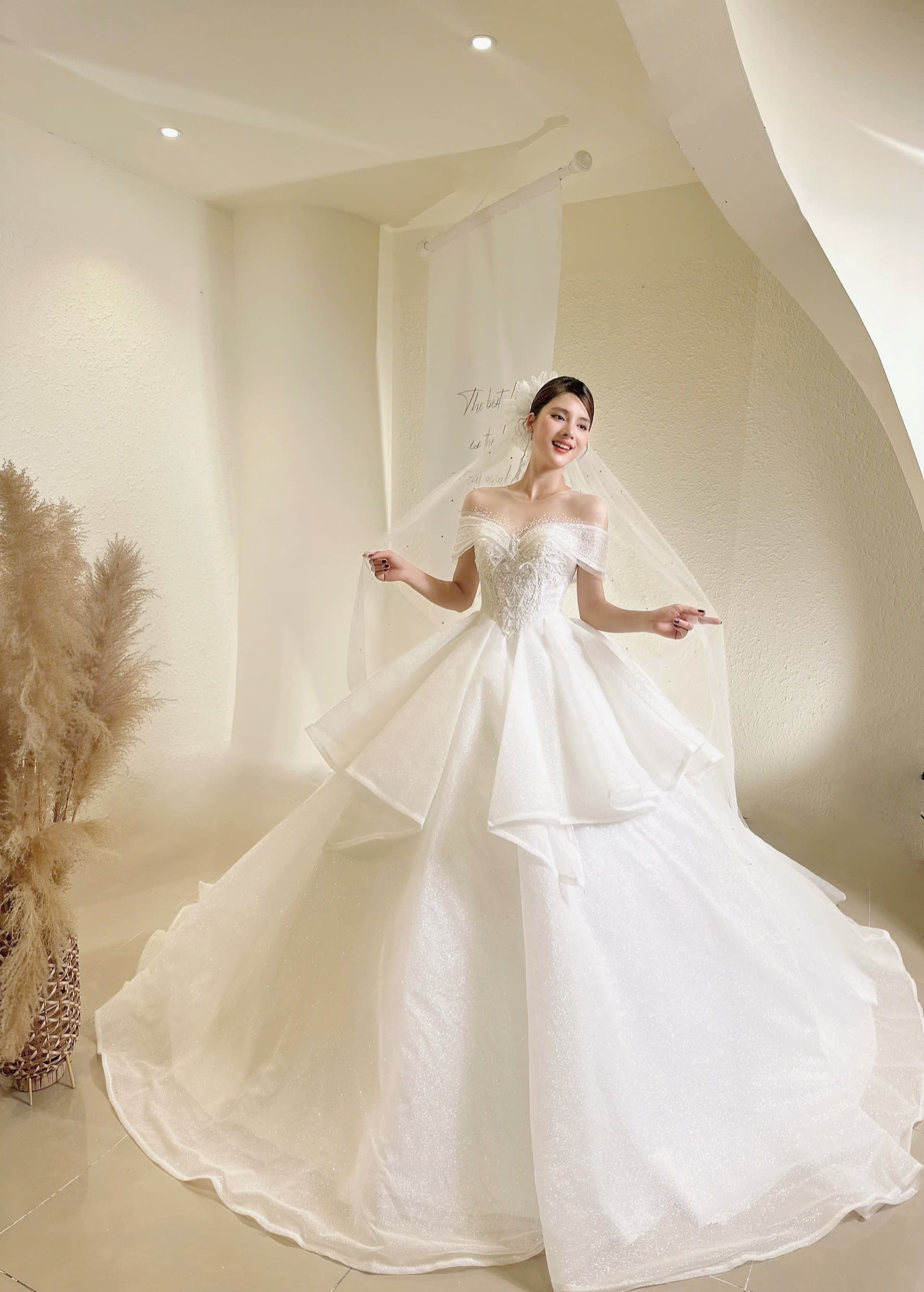 Váy cưới đính đá lấp lánh trễ vai là một tác phẩm nghệ thuật, một biểu tượng của sự sang trọng và đẳng cấp. Những viên đá lấp lánh được tinh tế đính kết từ trên vòng một xuống đến eo, tạo nên điểm nhấn lôi cuốn, khiến cô dâu trở nên quý phái và quyến rũ hơn bao giờ hết. Bên cạnh đó, chiếc váy cưới này còn được khắc họa thiết kế tầng lớp tạo thêm sự bồng bềnh khi cô dâu khoác lên người.