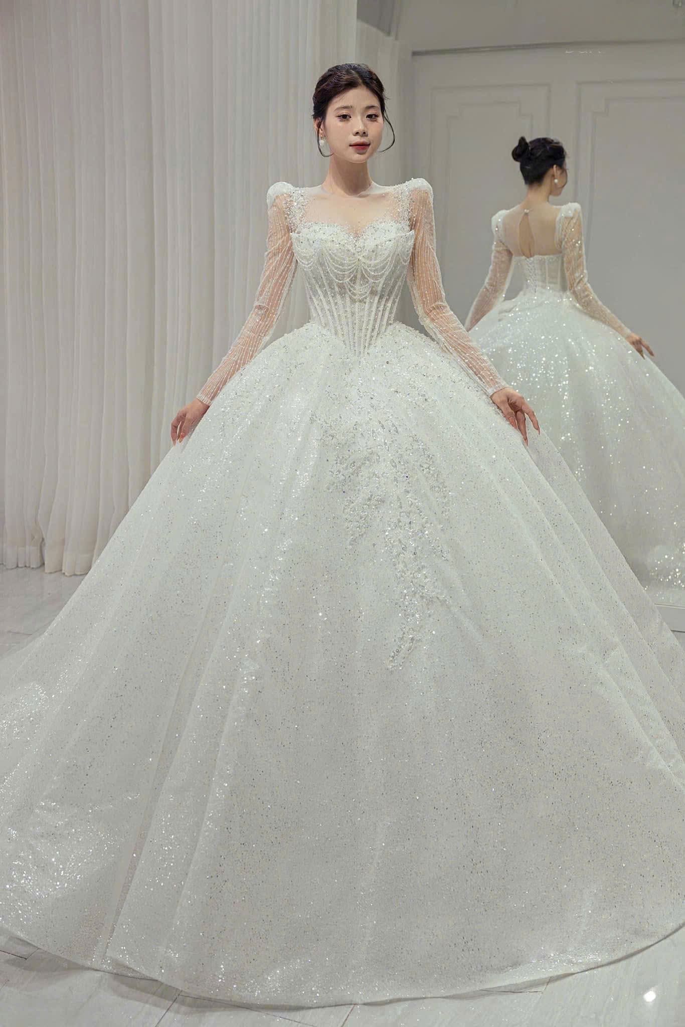 Có thể nói, váy cưới tùng xòe lấp lánh sang trọng là mẫu váy cưới từ 3 đến 5 triệu có kiểu được nhiều cô dâu lựa chọn khi diện trong ngày trọng đại. Đây là mẫu váy cưới có phần thiết kế thân váy xòe bồng lớn phần tầng dưới váy, ở phần trên sẽ ôm sát vóc dáng người mặc để tạo ra hiệu ứng váy công chúa lộng lẫy. Bên cạnh đó, chiếc váy cưới còn phần tay dài rất phù hợp cho các cô dâu lựa chọn để mặc khi làm lễ ở nhà thờ hay các cô dâu yêu thích sự kính đáo.