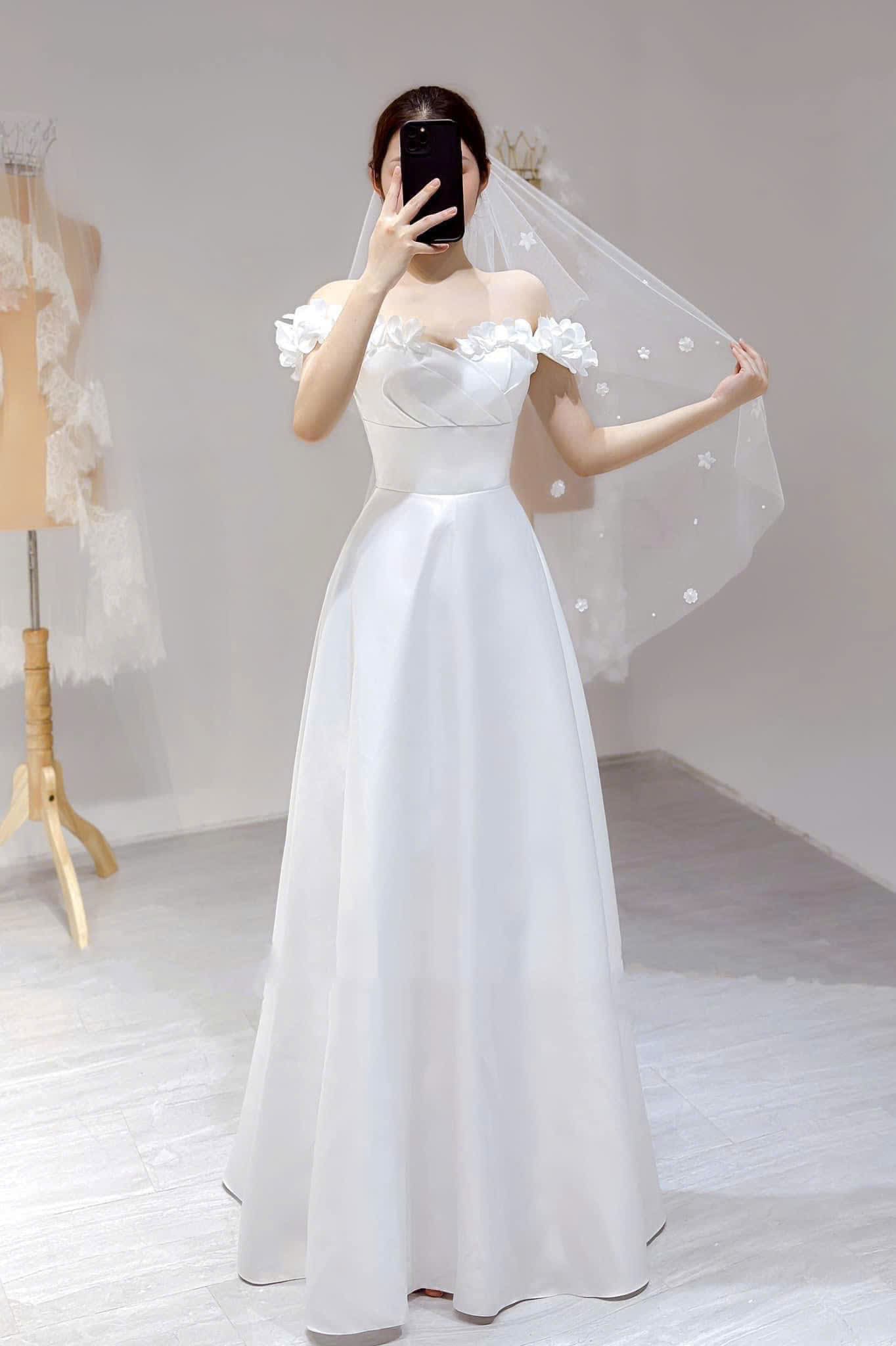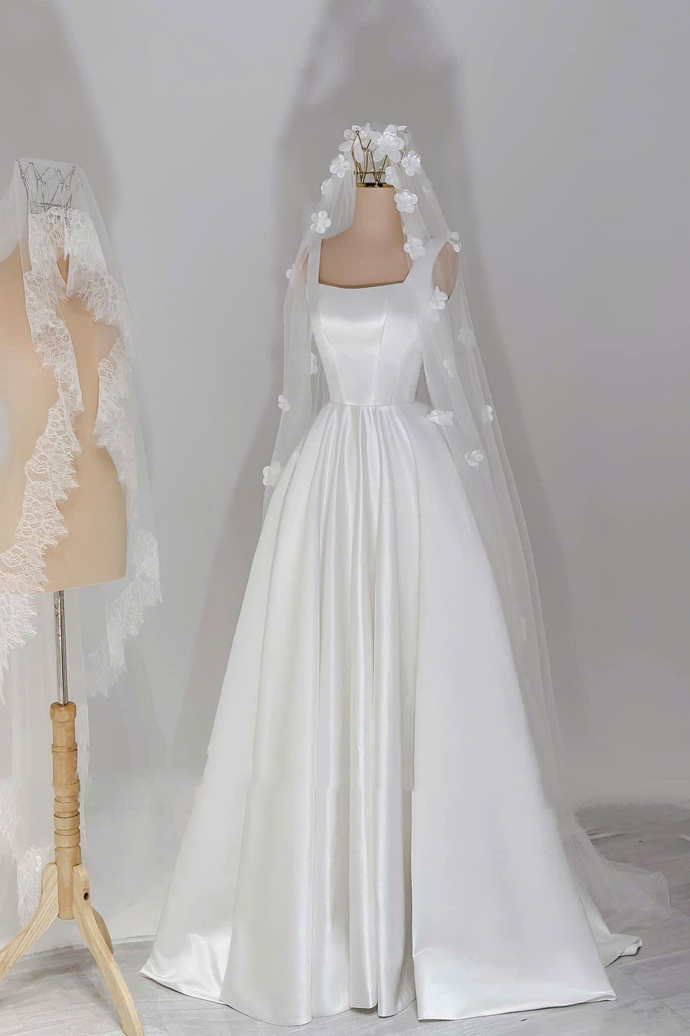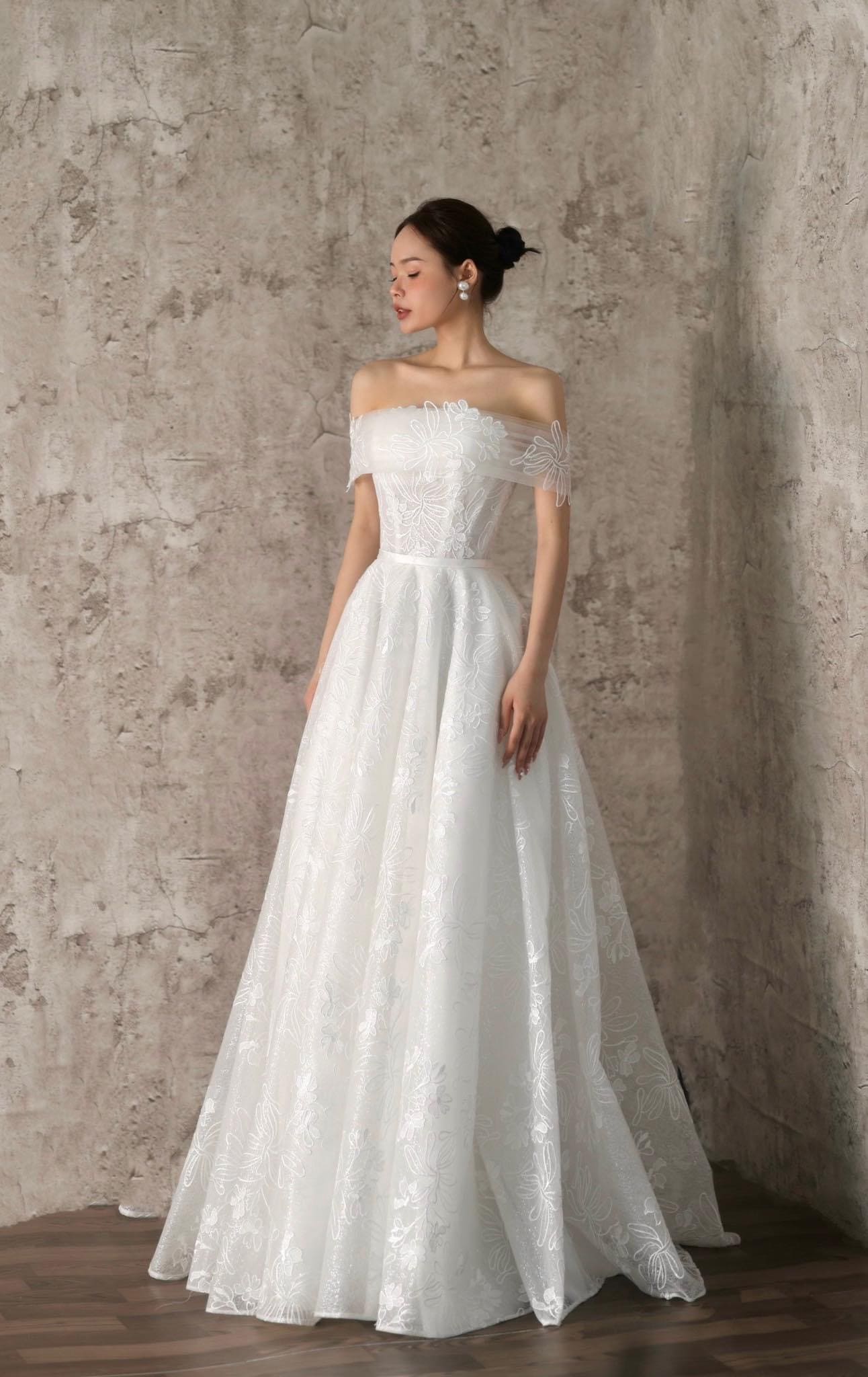 Váy cưới chữ A không quá cồng kềnh như váy cưới dáng công chúa, nhưng vẫn đủ bồng bềnh để tạo vẻ thướt tha. Với thiết kế này, cô dâu có thể di chuyển thoải mái mà vẫn giữ được sự sang trọng, phù hợp với cả những đám cưới truyền thống lẫn hiện đại.