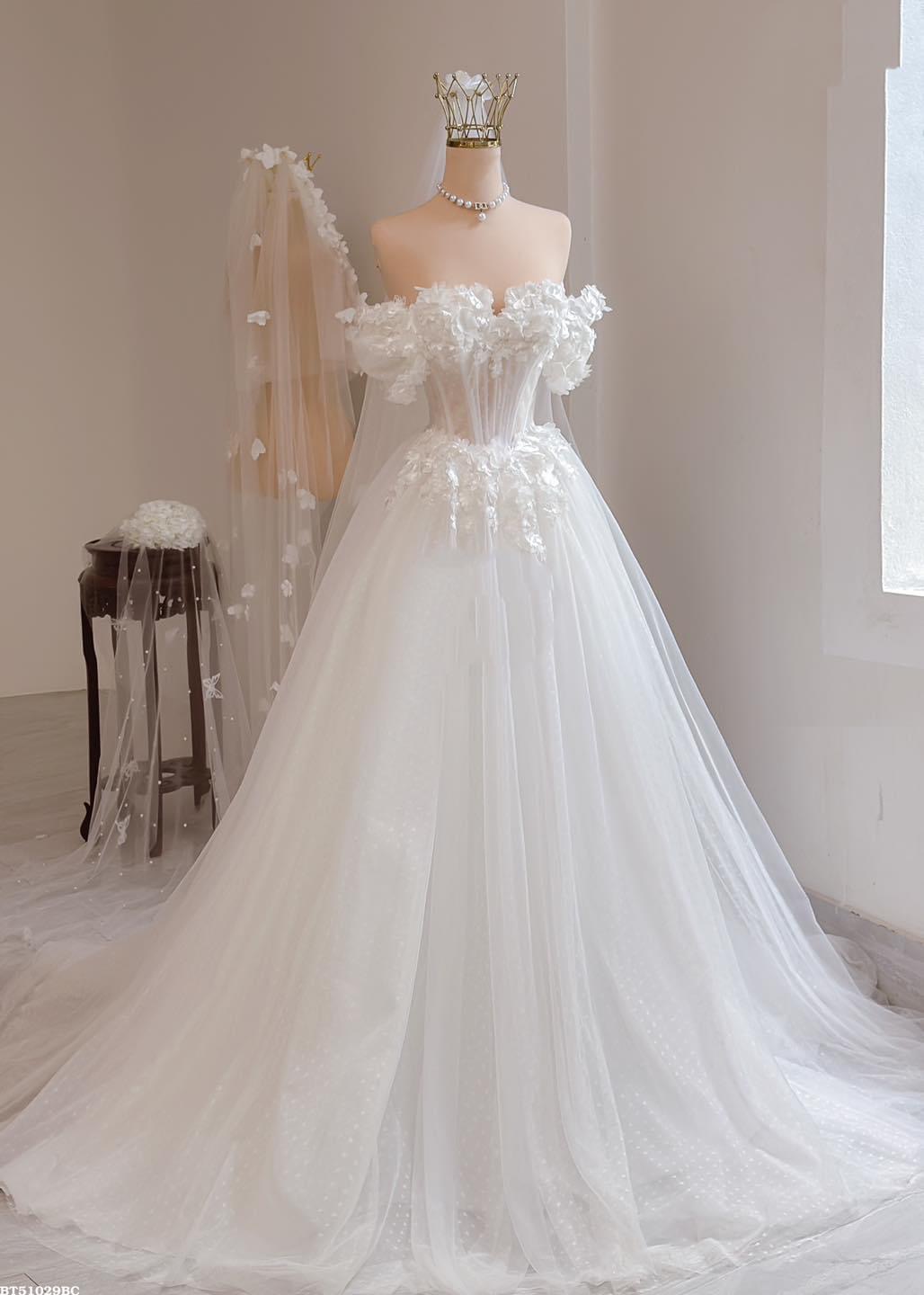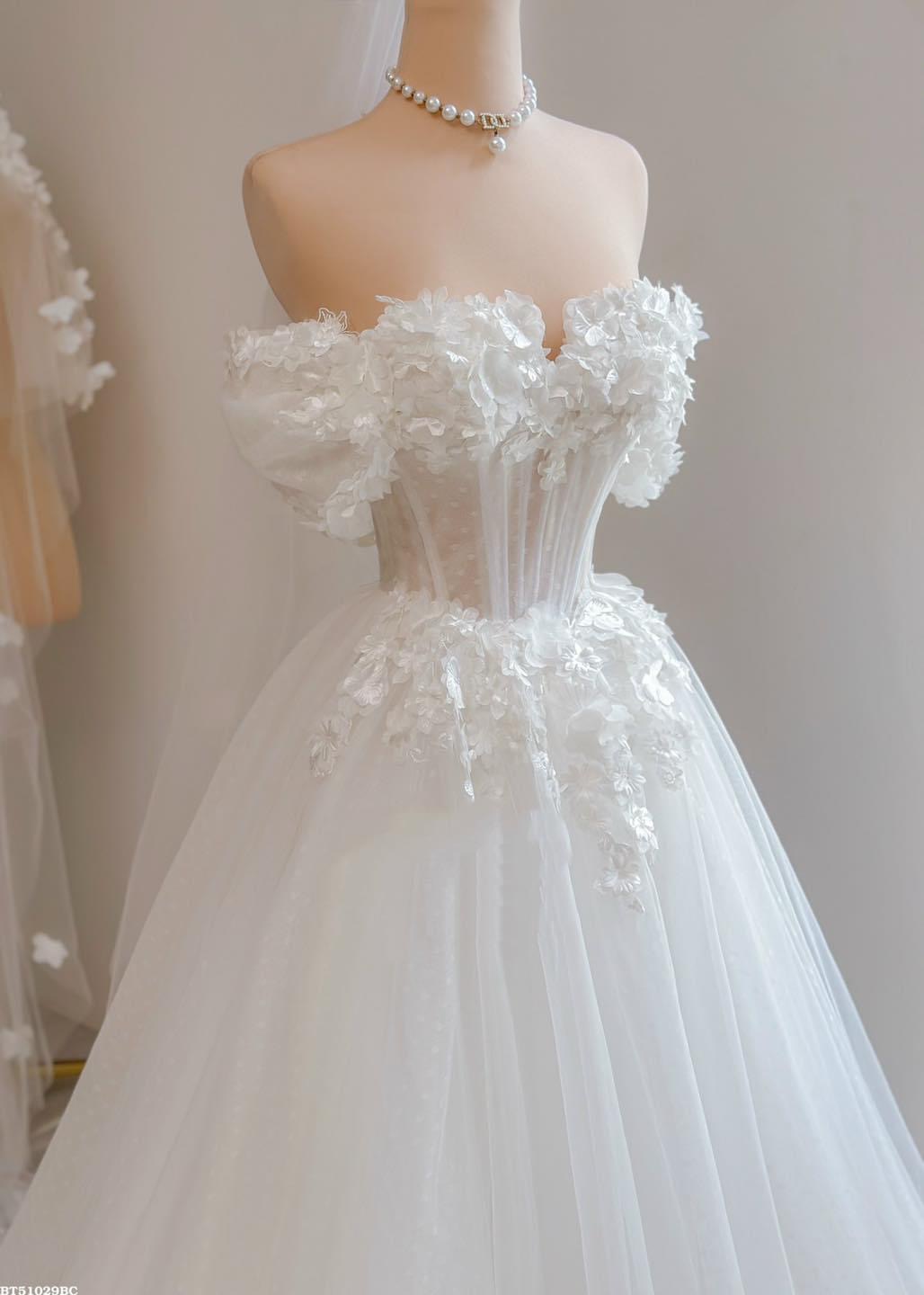 Thiết kế: Váy cưới suông thiết kế trễ vai kết hoa bèo nhẹ nhàng