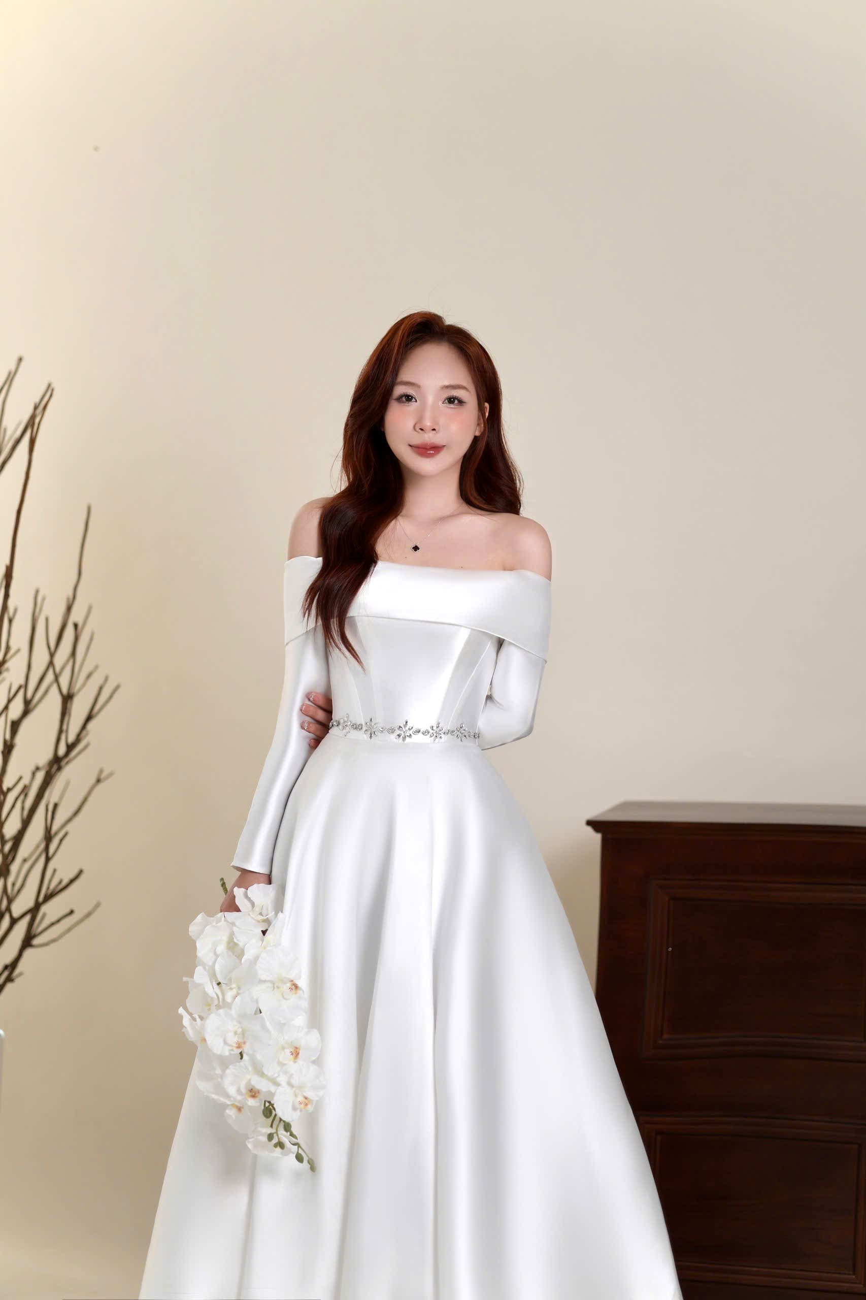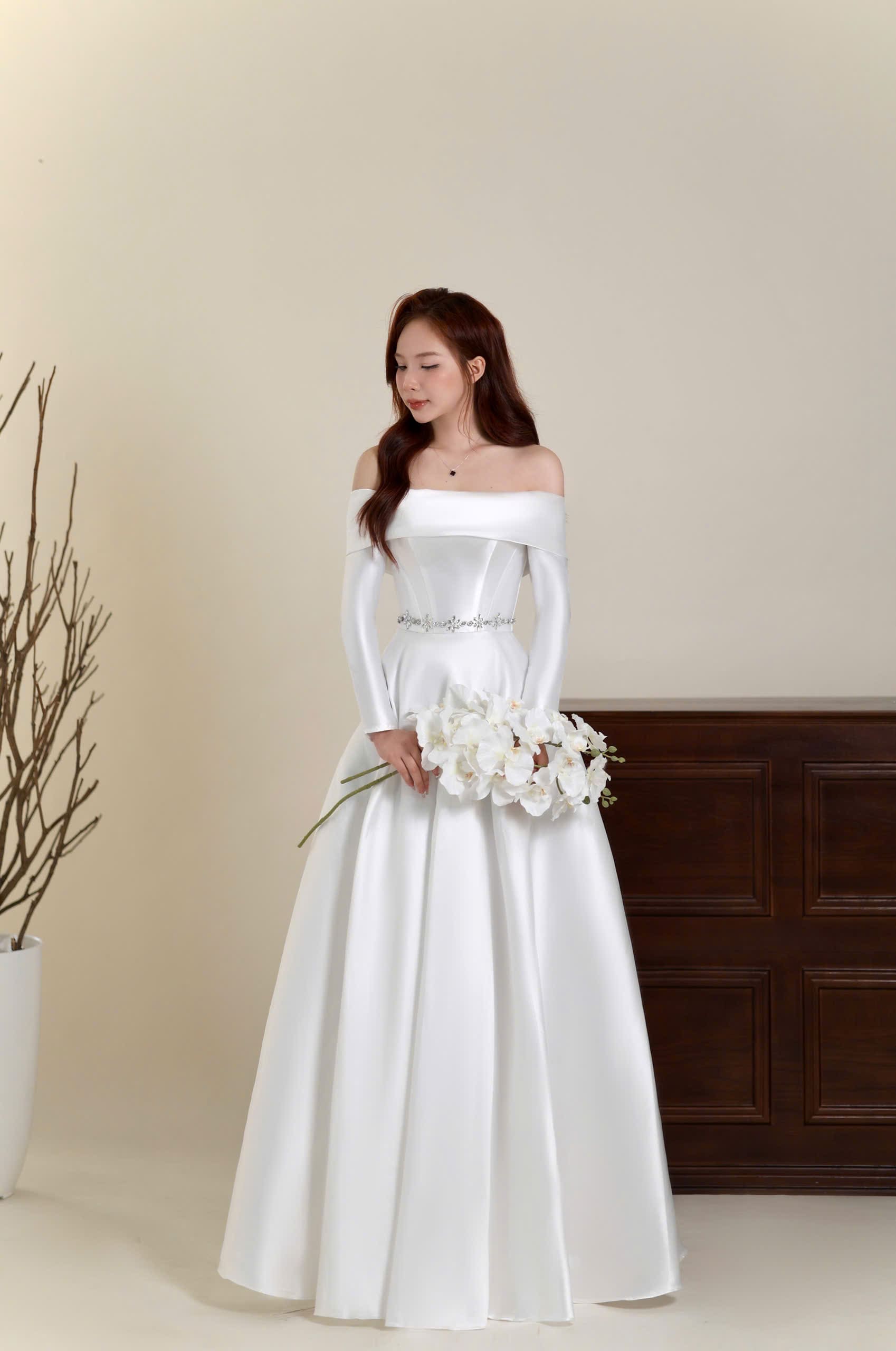 VÁY CƯỚI FORM A TRỄ VAI TAY DÀI THANH LỊCH