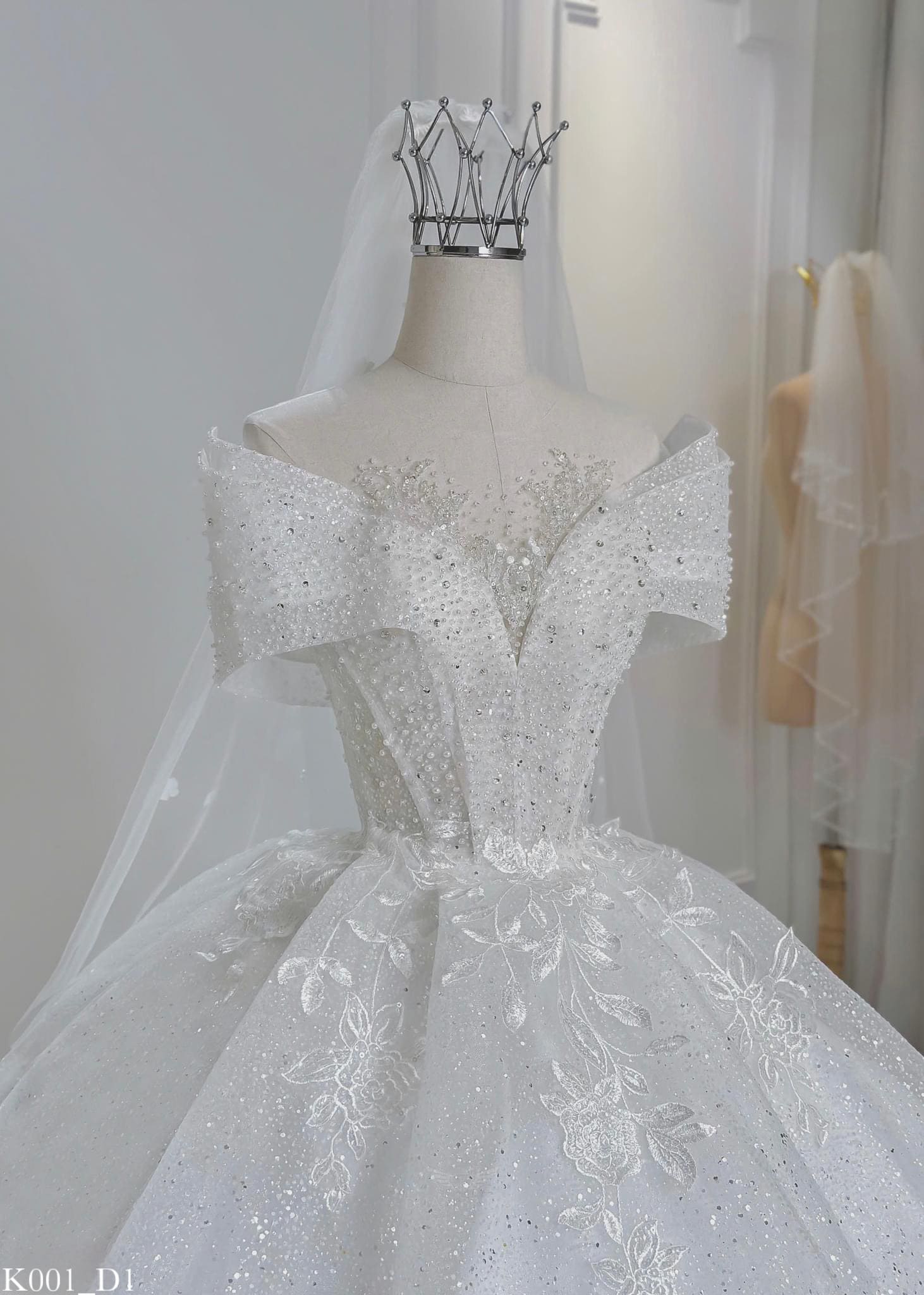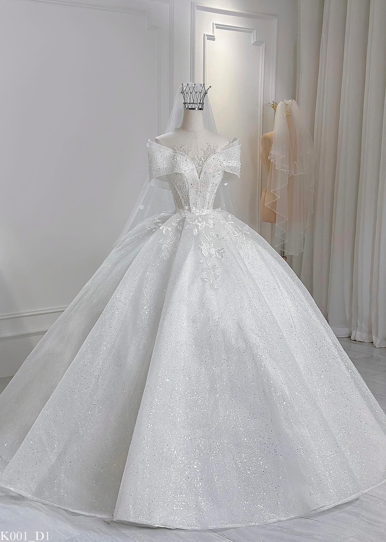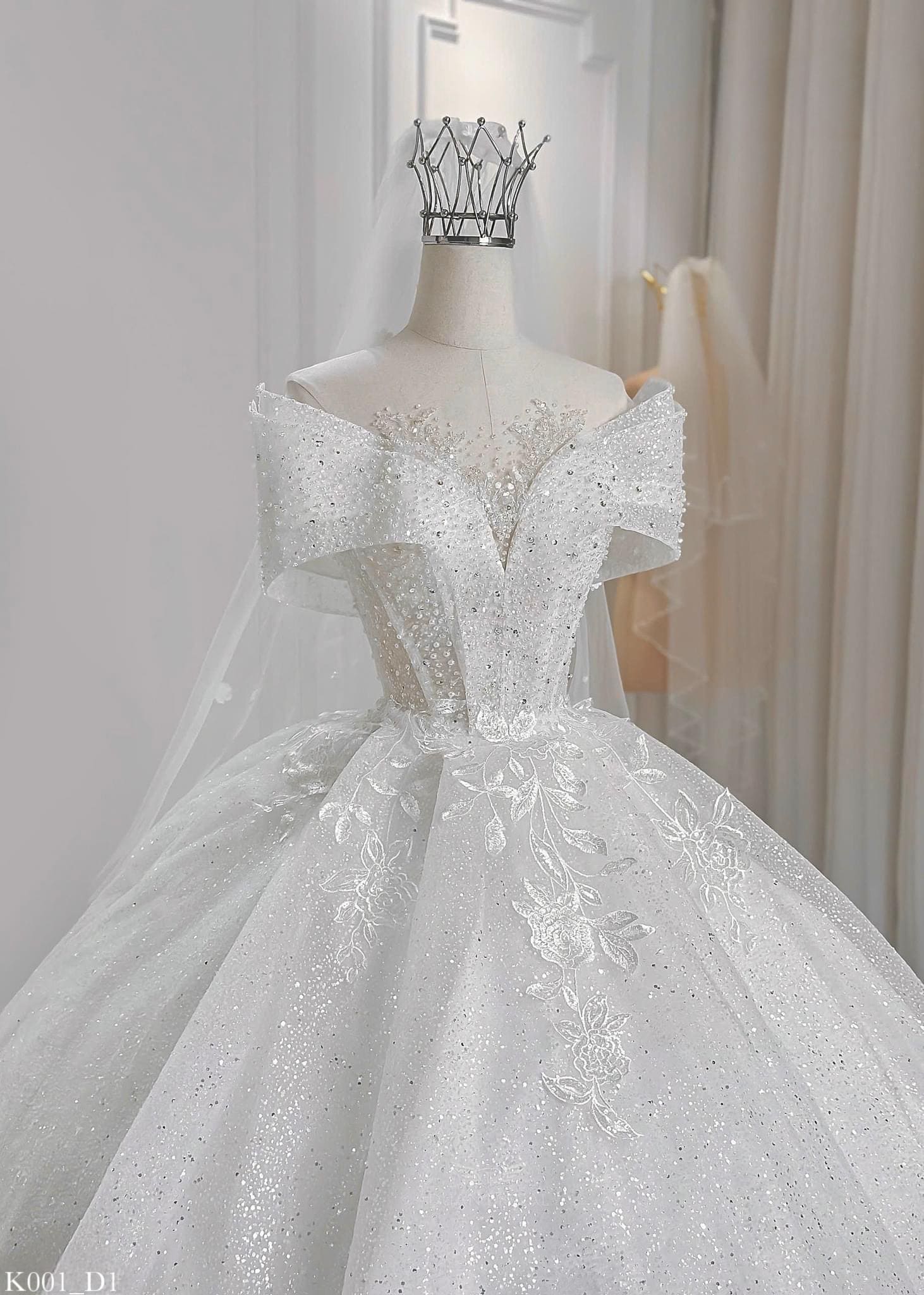 Thiết kế: Váy cưới làm lễ kiểu trễ vai tùng kim sa lấp lánh