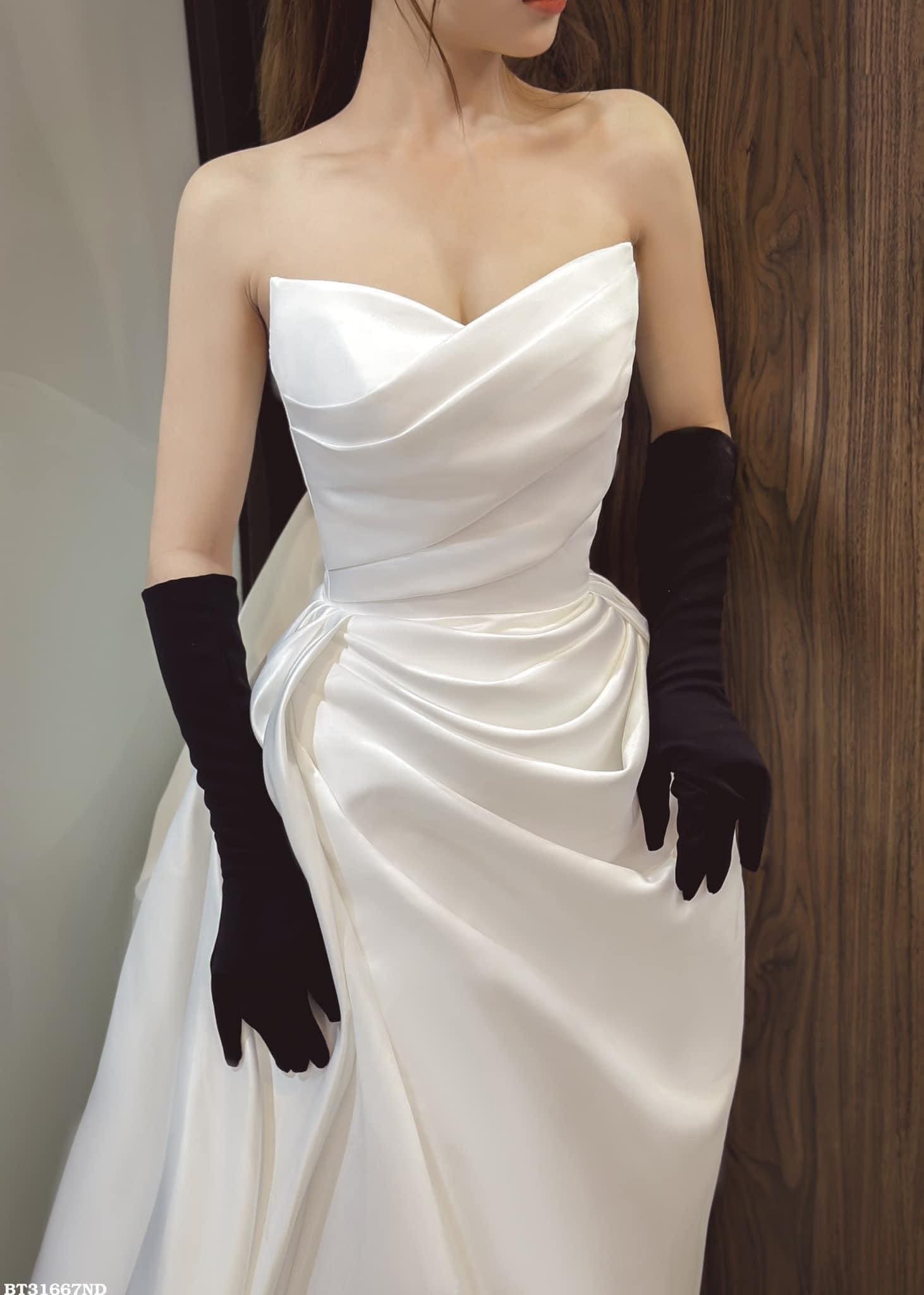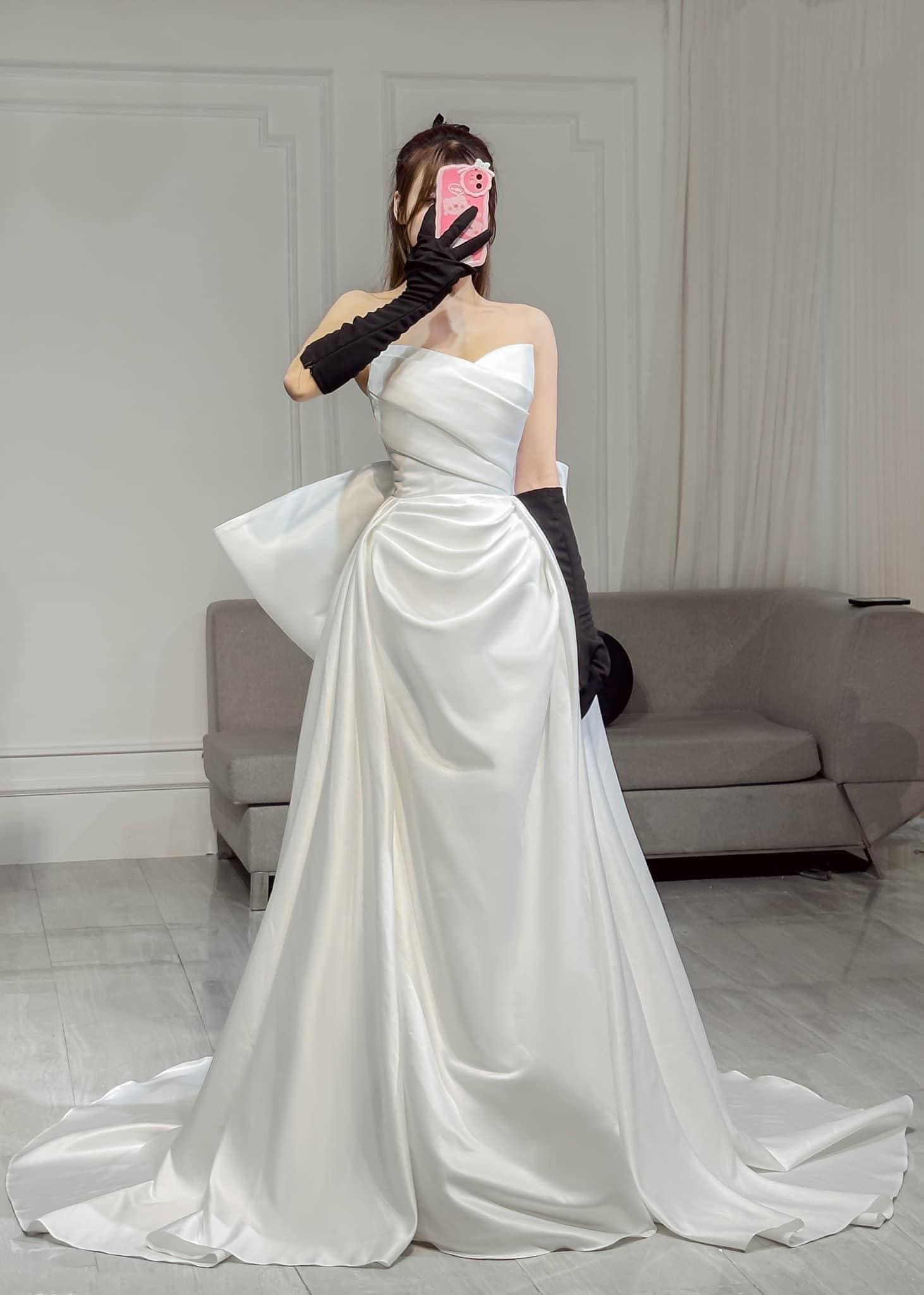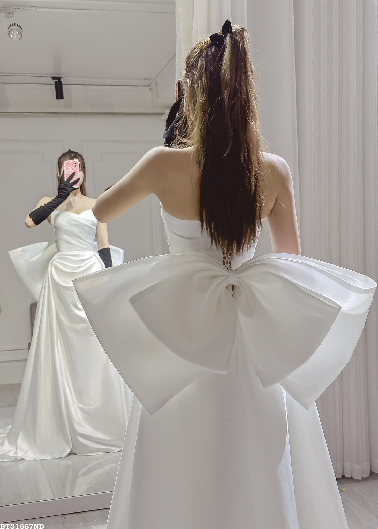 Thiết kế: Váy cưới đi bàn cô dâu thiết kế cúp ngực trơn đơn giản kèm nơ rời