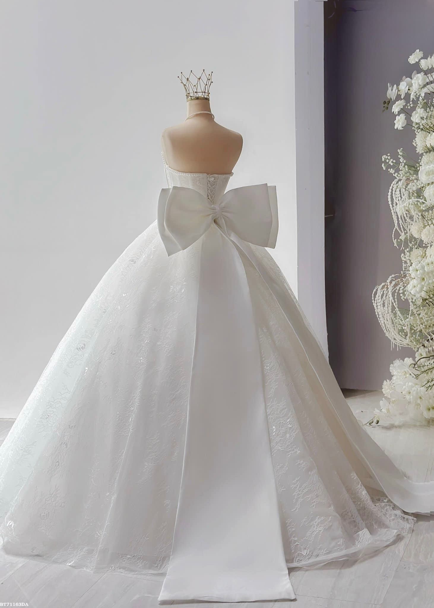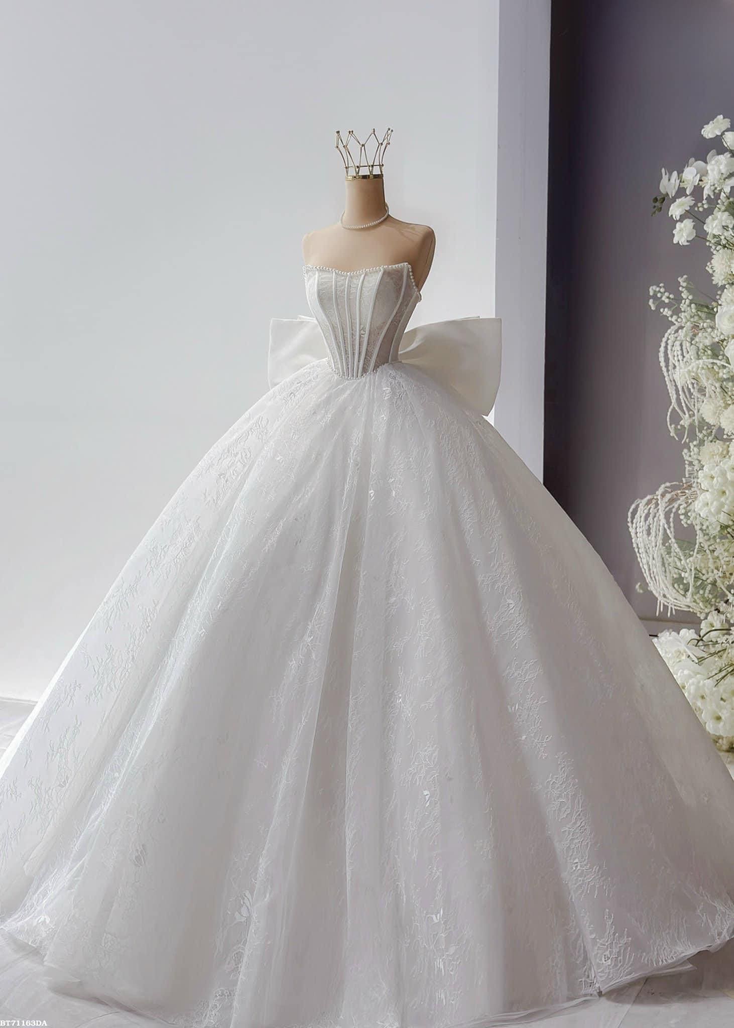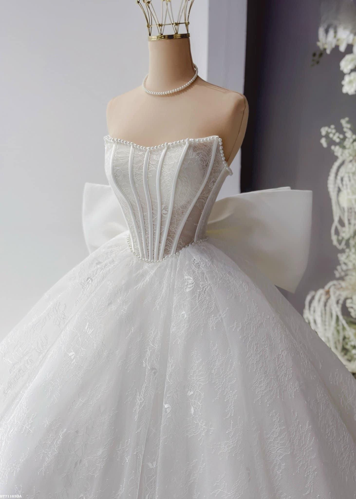Thiết kế: Váy cưới làm lễ cúp ngực phối nơ rời kèm găng tay phong cách tiểu thư sang trọng