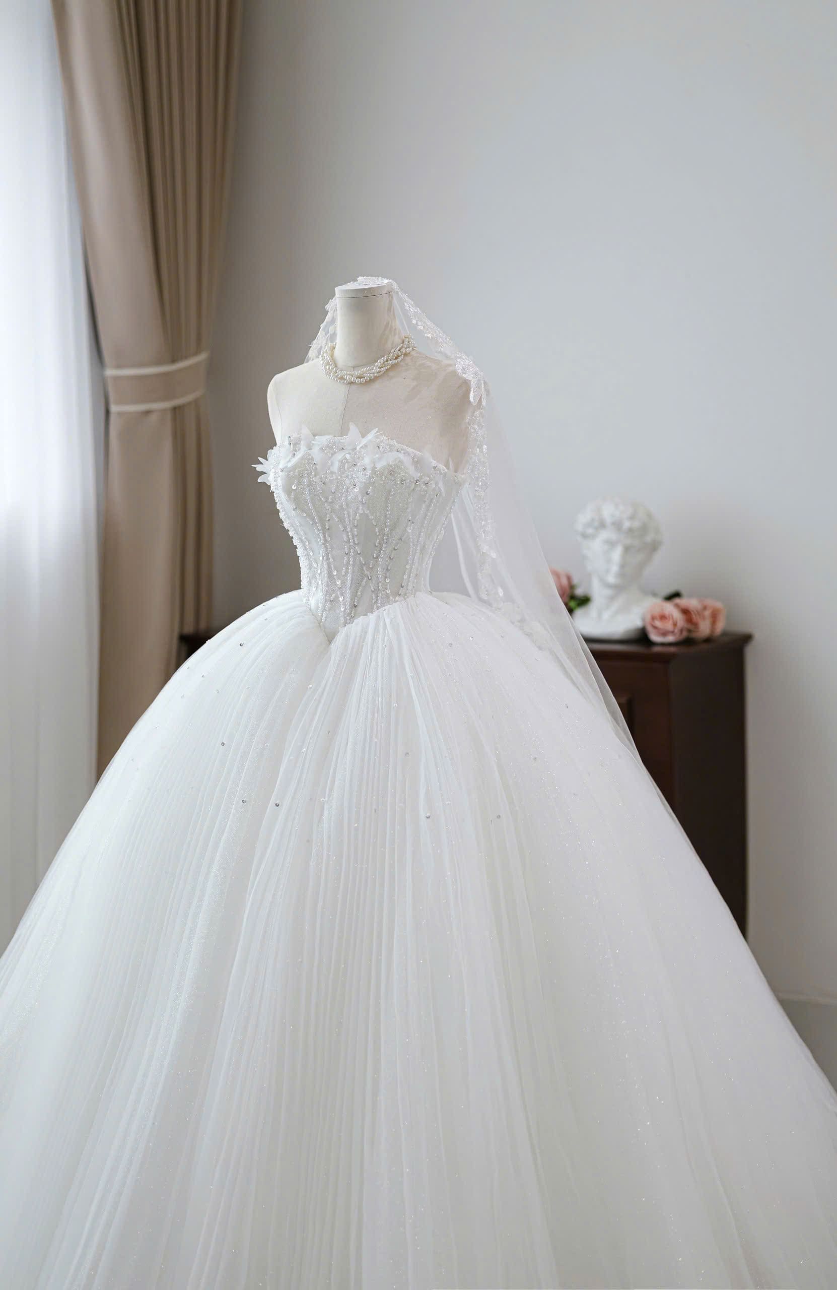 VÁY CƯỚI LÀM LỄ KIỂU TRỄ VAI TÙNG REN MI XINH XẮN