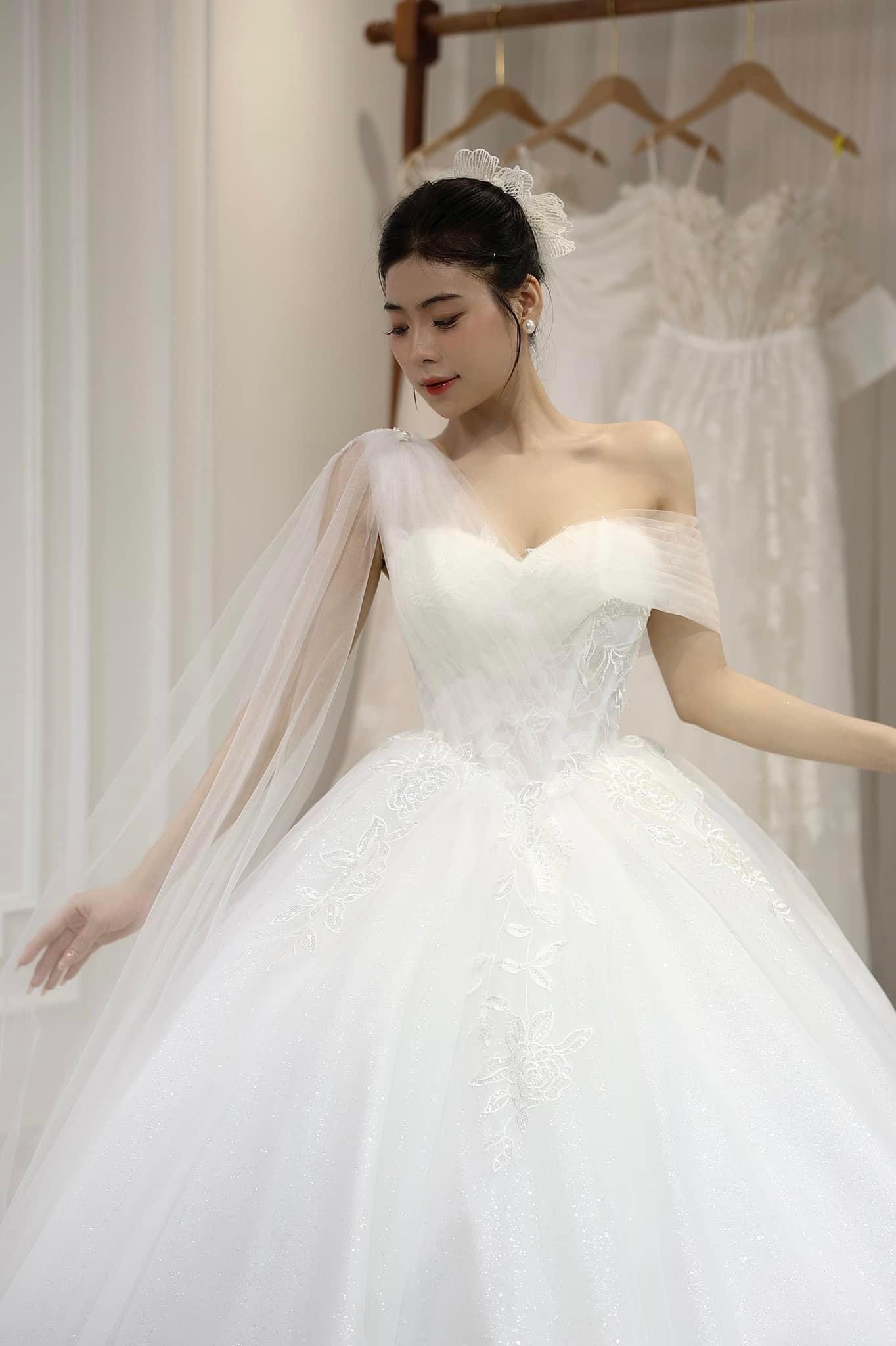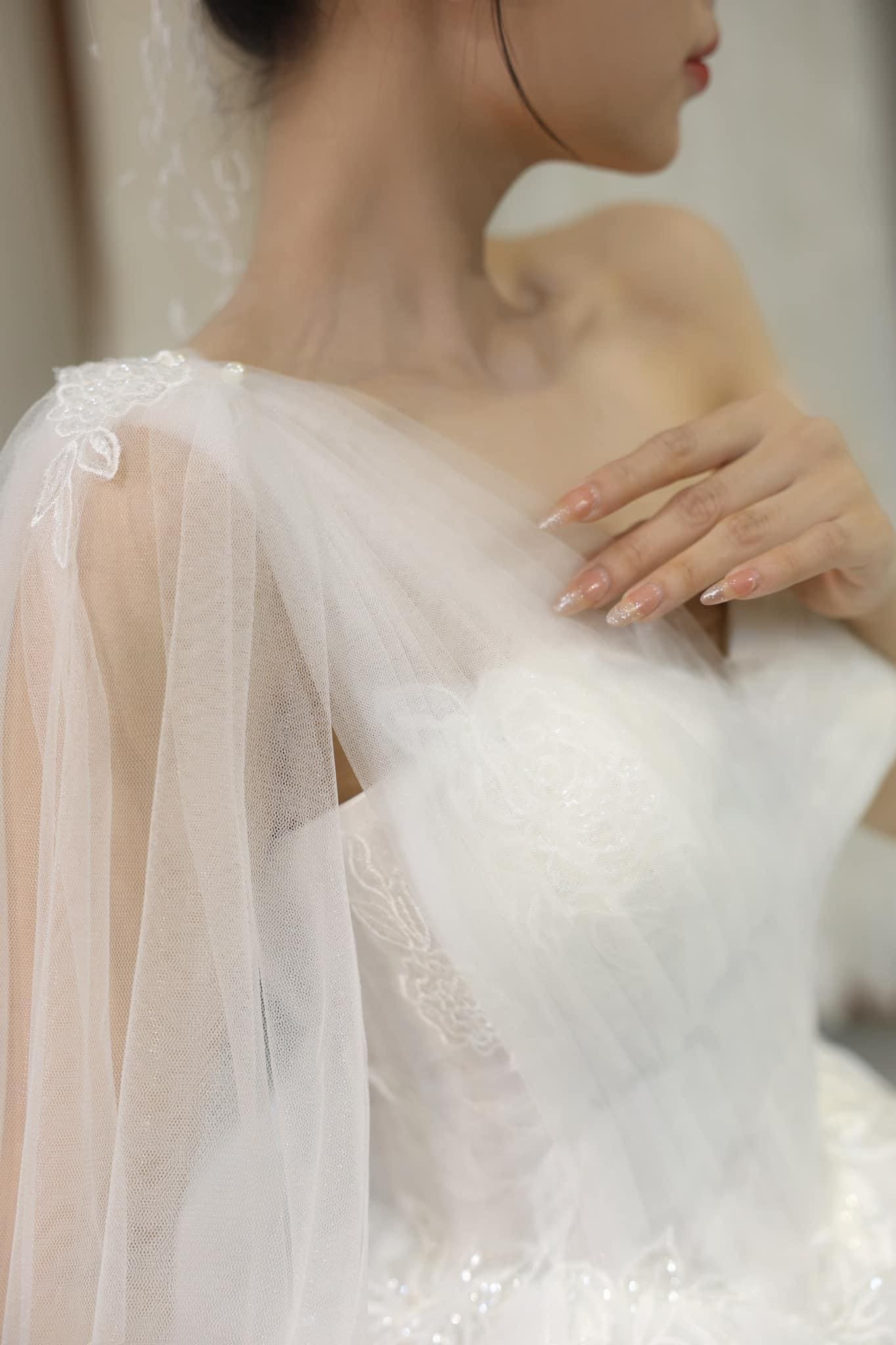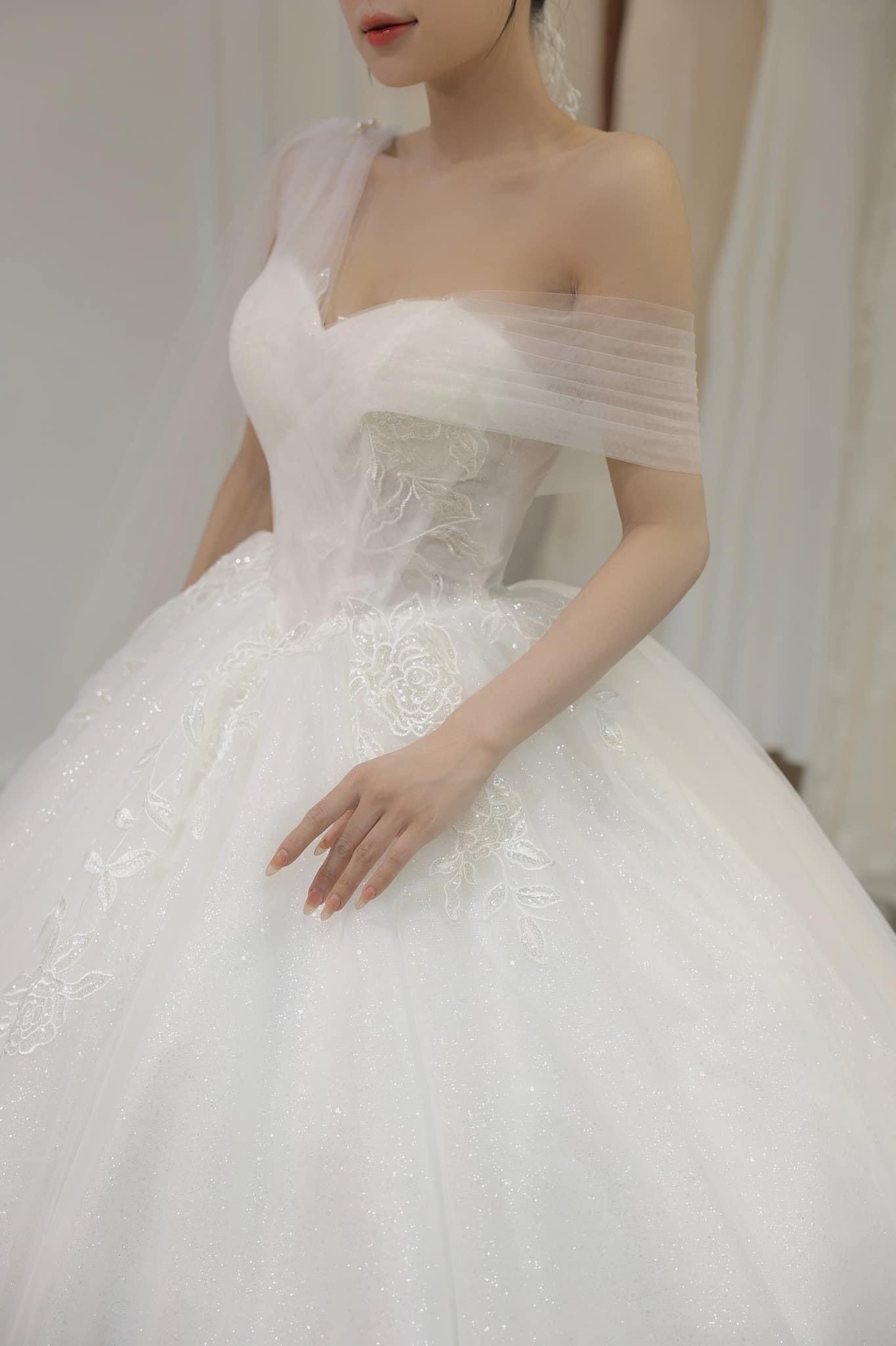 Thiết kế: Váy cưới làm lễ kiểu lệch vai tùng kim tuyến phủ voan nhẹ nhàng