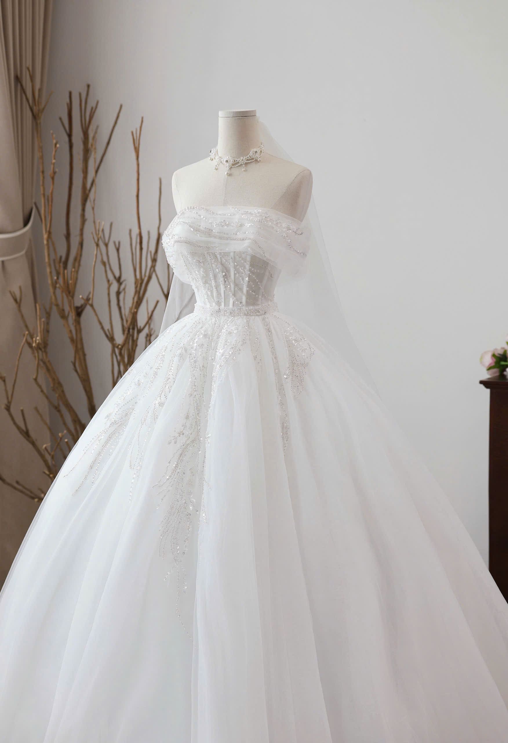 VÁY CƯỚI LÀM LỄ KIỂU TRỄ VAI TÙNG DỆT KIM SA SANG TRỌNG