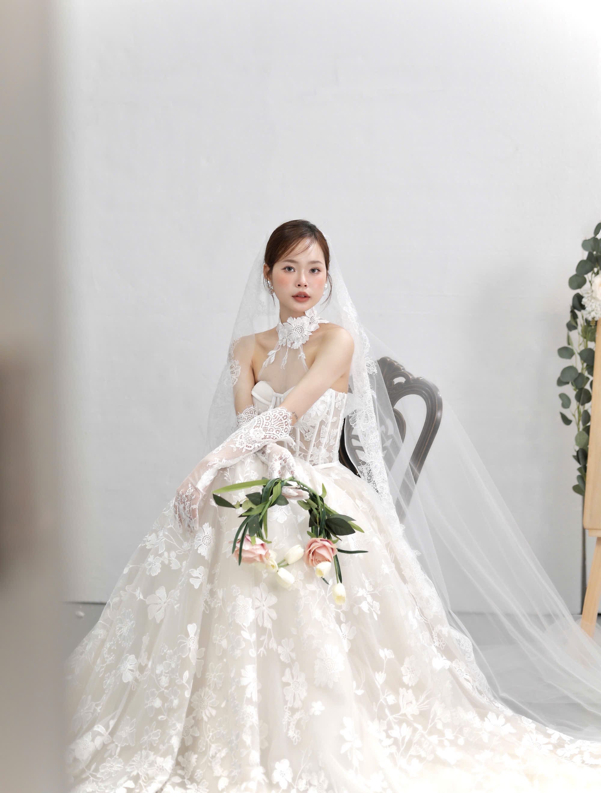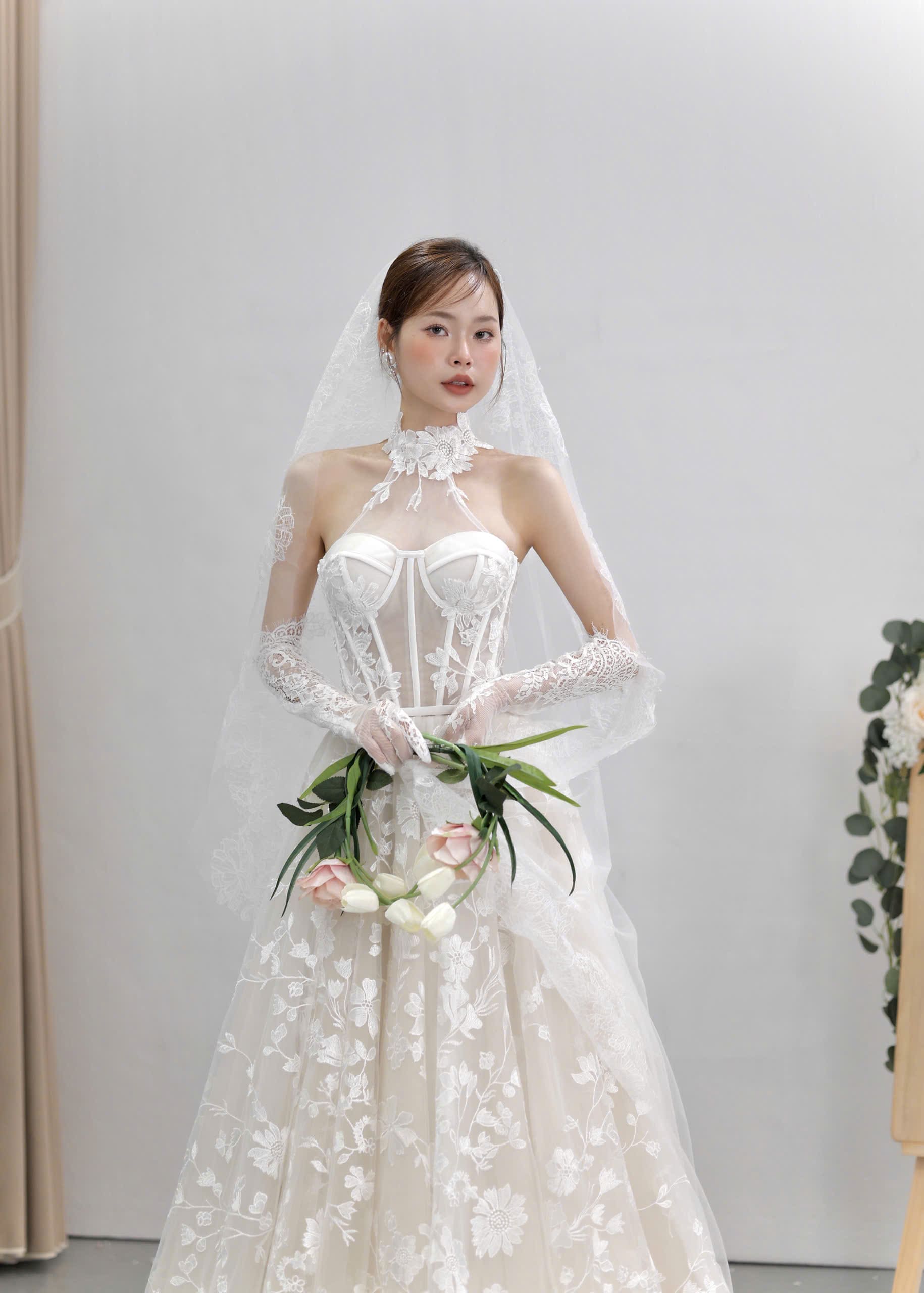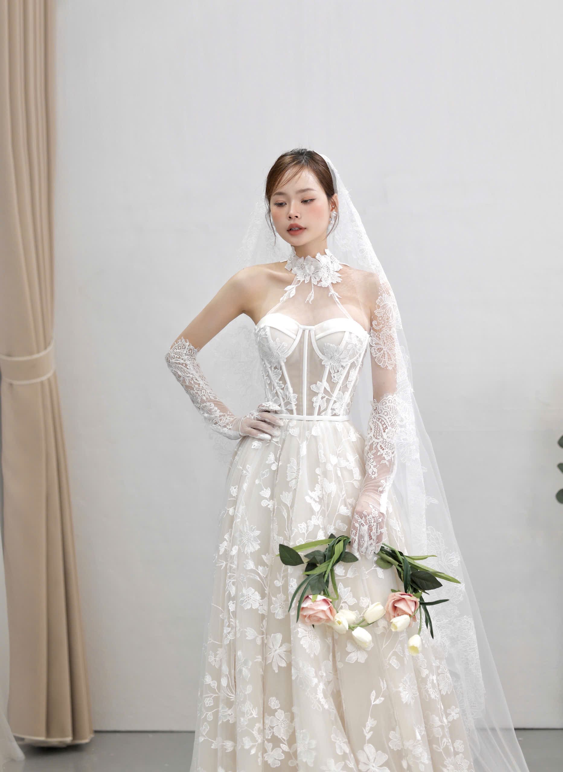 VÁY CƯỚI SUÔNG ĐI BÀN KÈM GĂNG TAY REN CỔ YẾM SANG TRỌNG