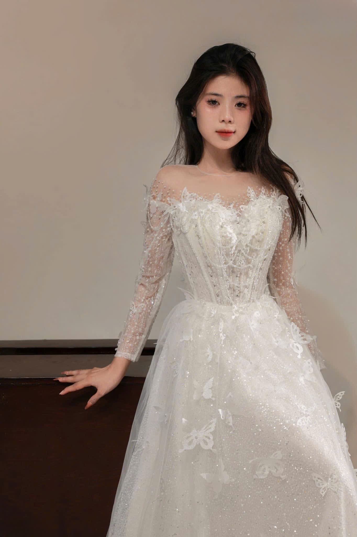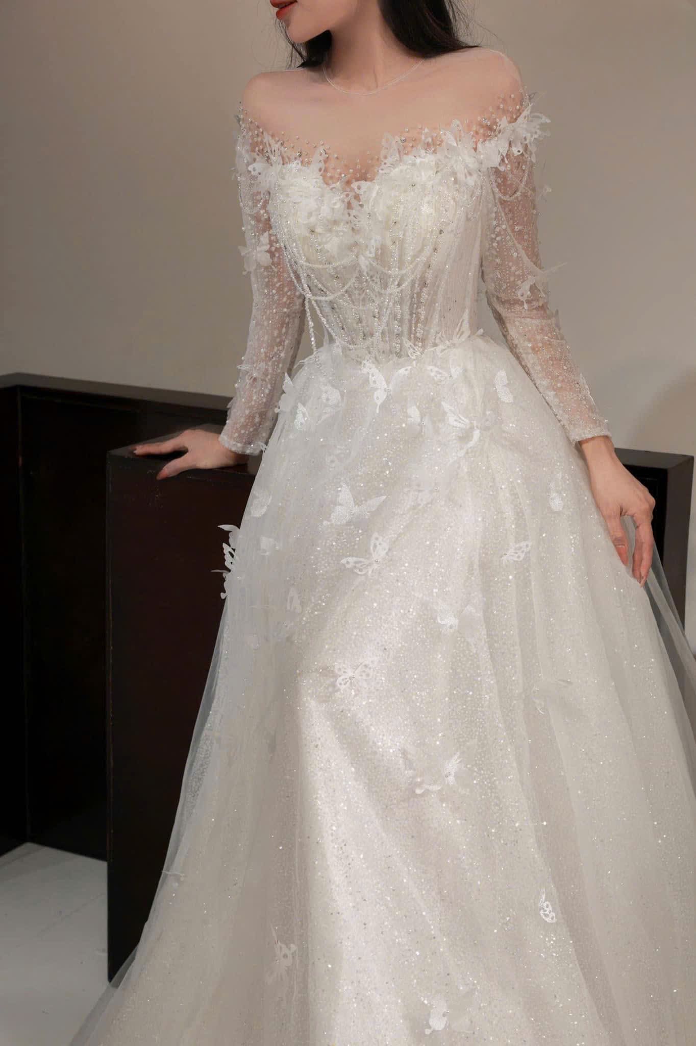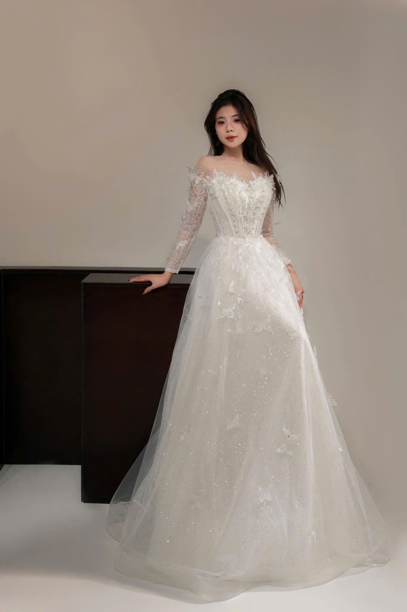 VÁY CƯỚI SUÔNG KIỂU TRỄ VAI KẾT HỒ ĐIỆP XINH XẮN
