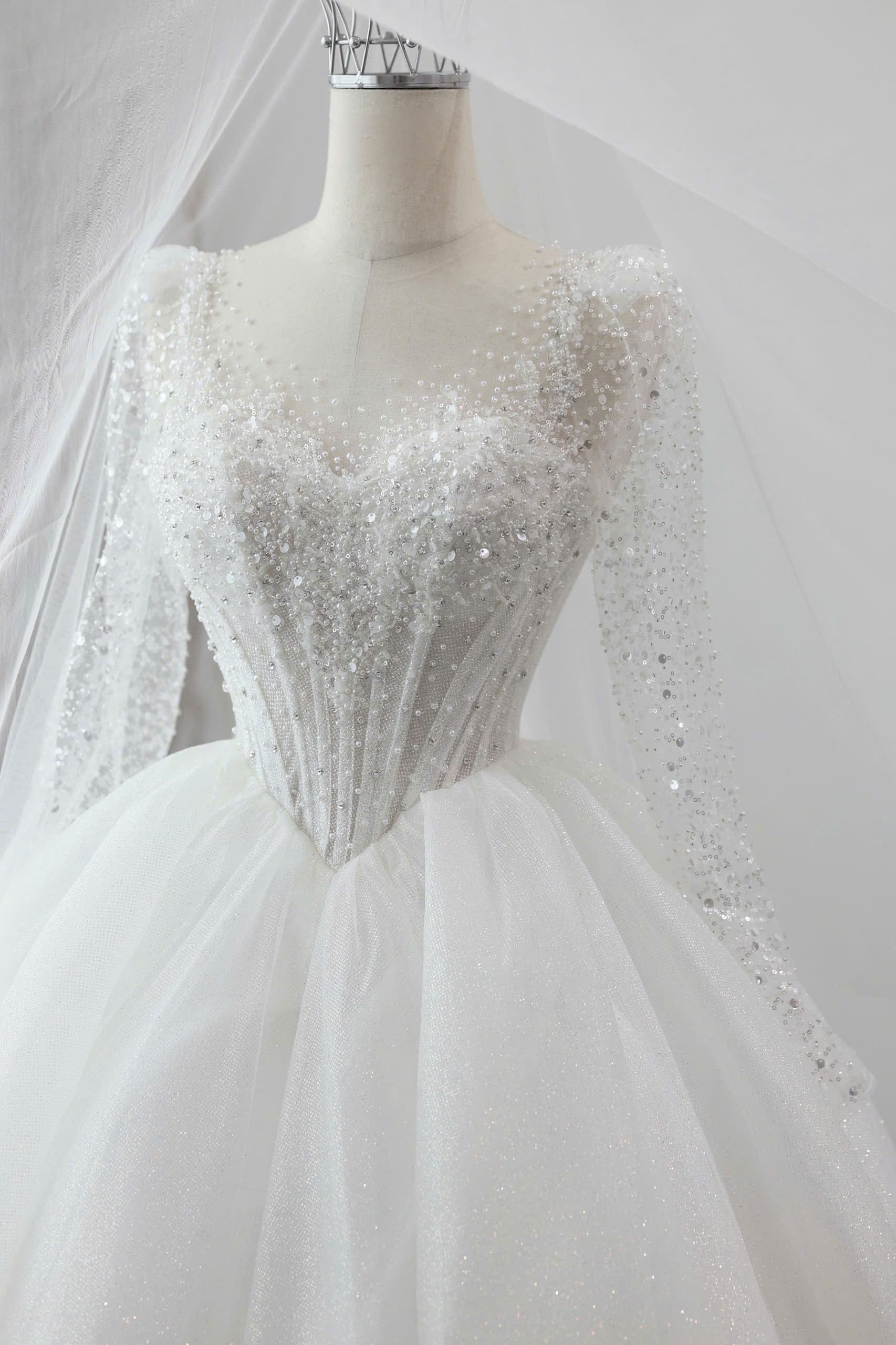VÁY CƯỚI TAY DÀI TÙNG KIM SA ĐÍNH KẾT NHẸ NHÀNG