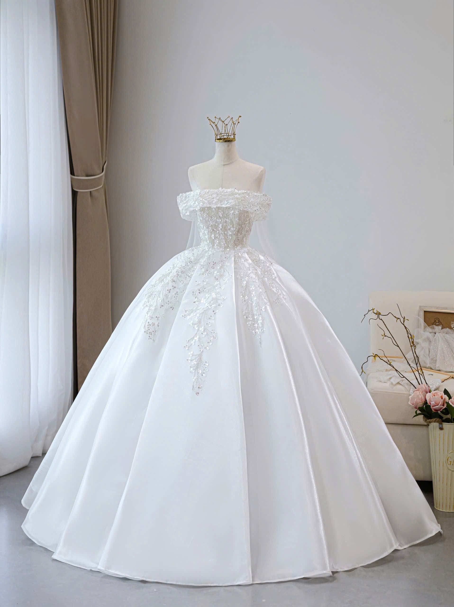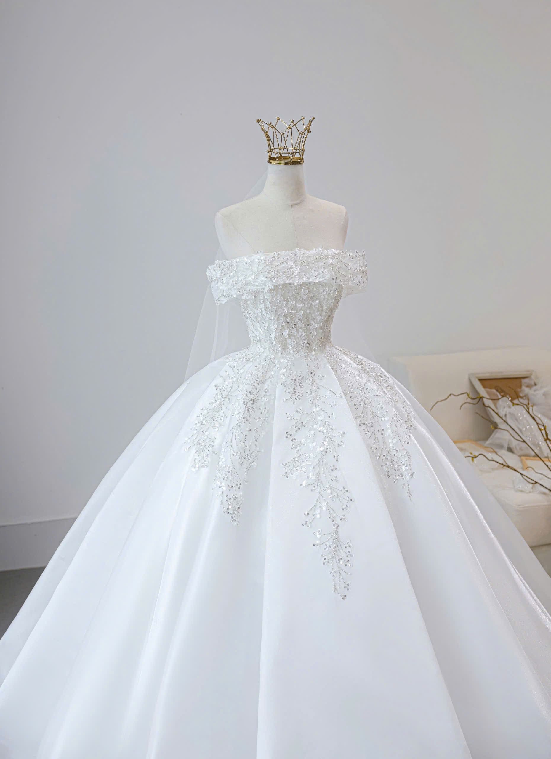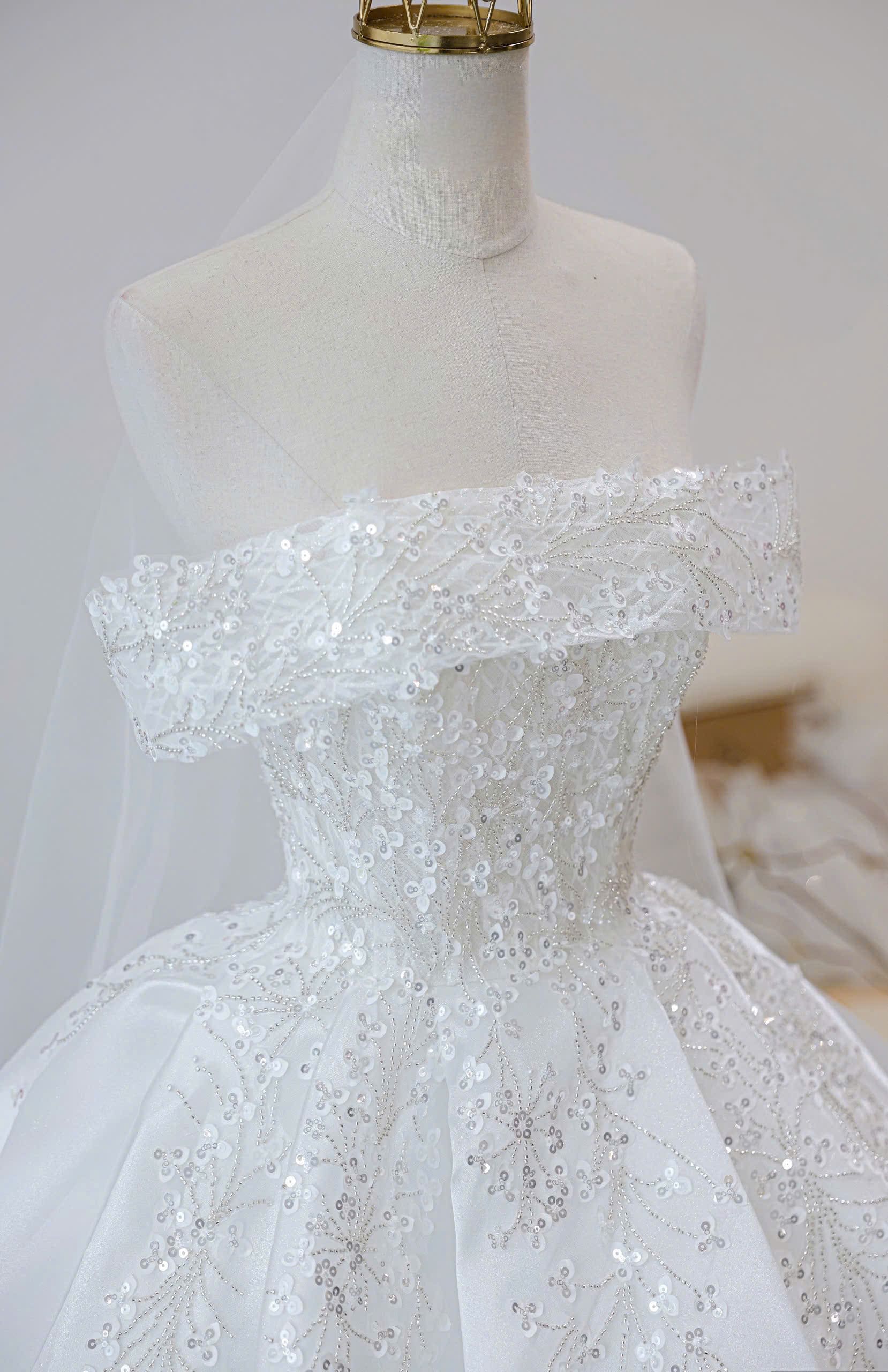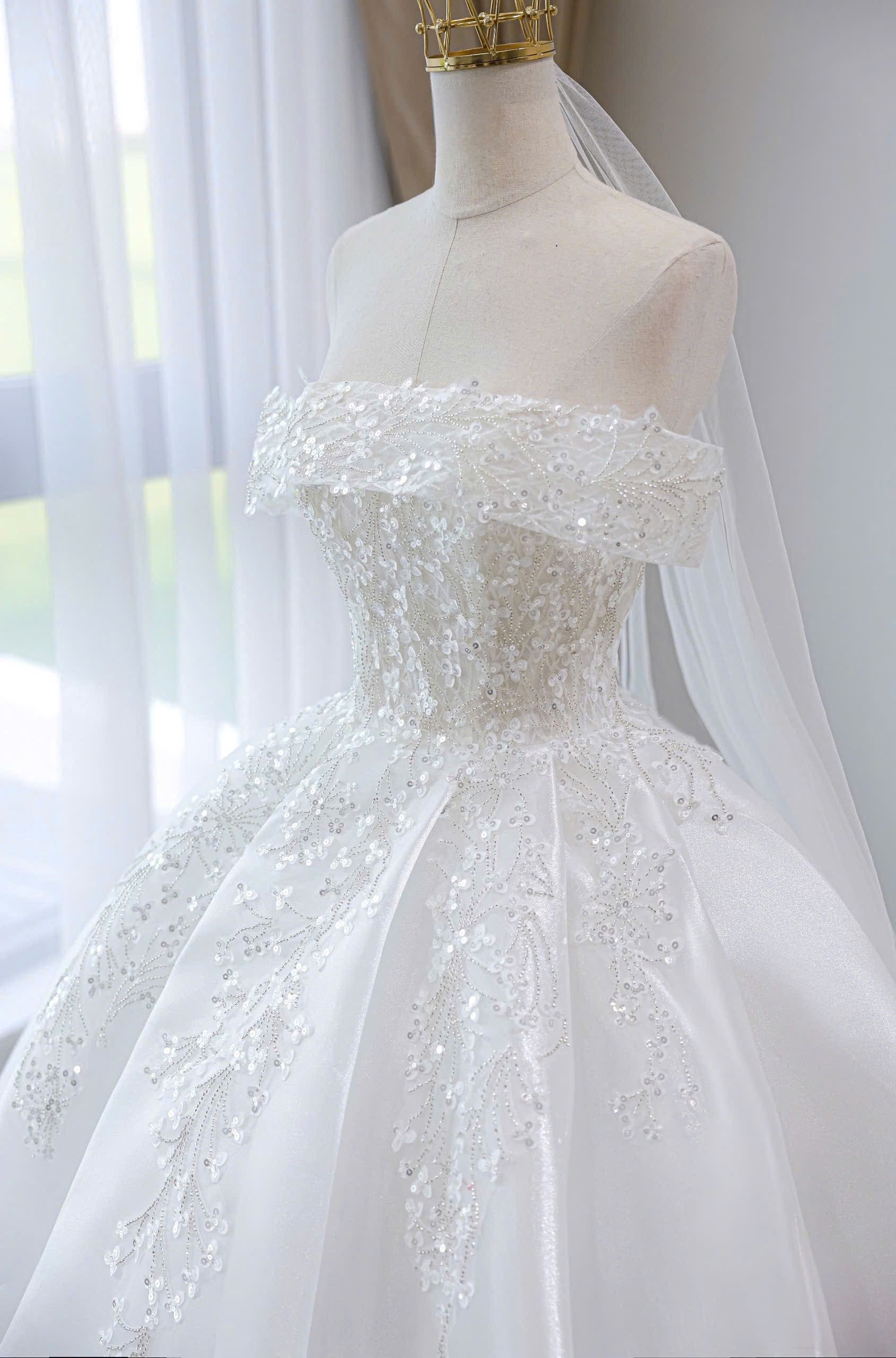 VÁY CƯỚI KIỂU TRỄ VAI ĐÍNH KẾT KIM SA LẤP LÁNH