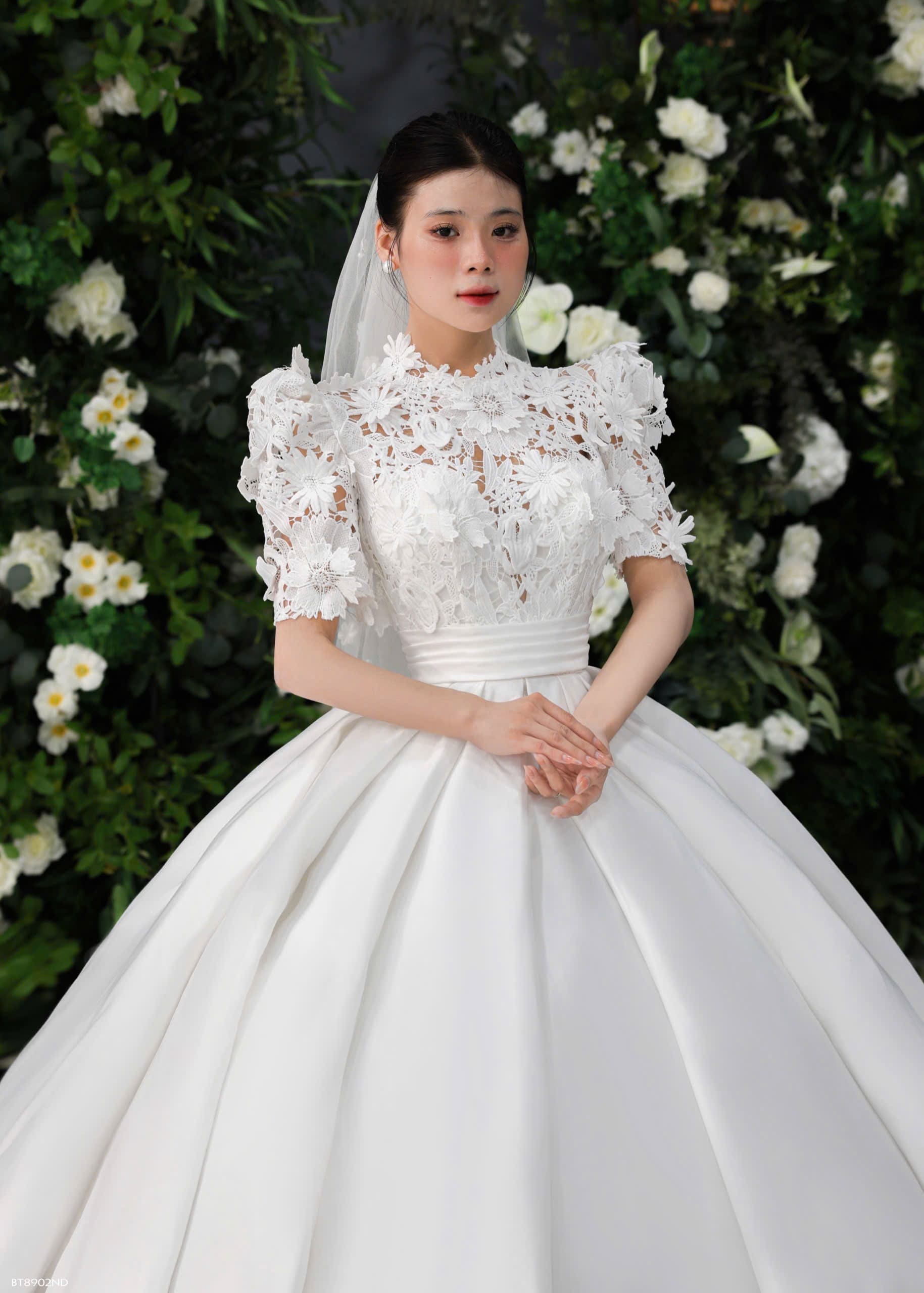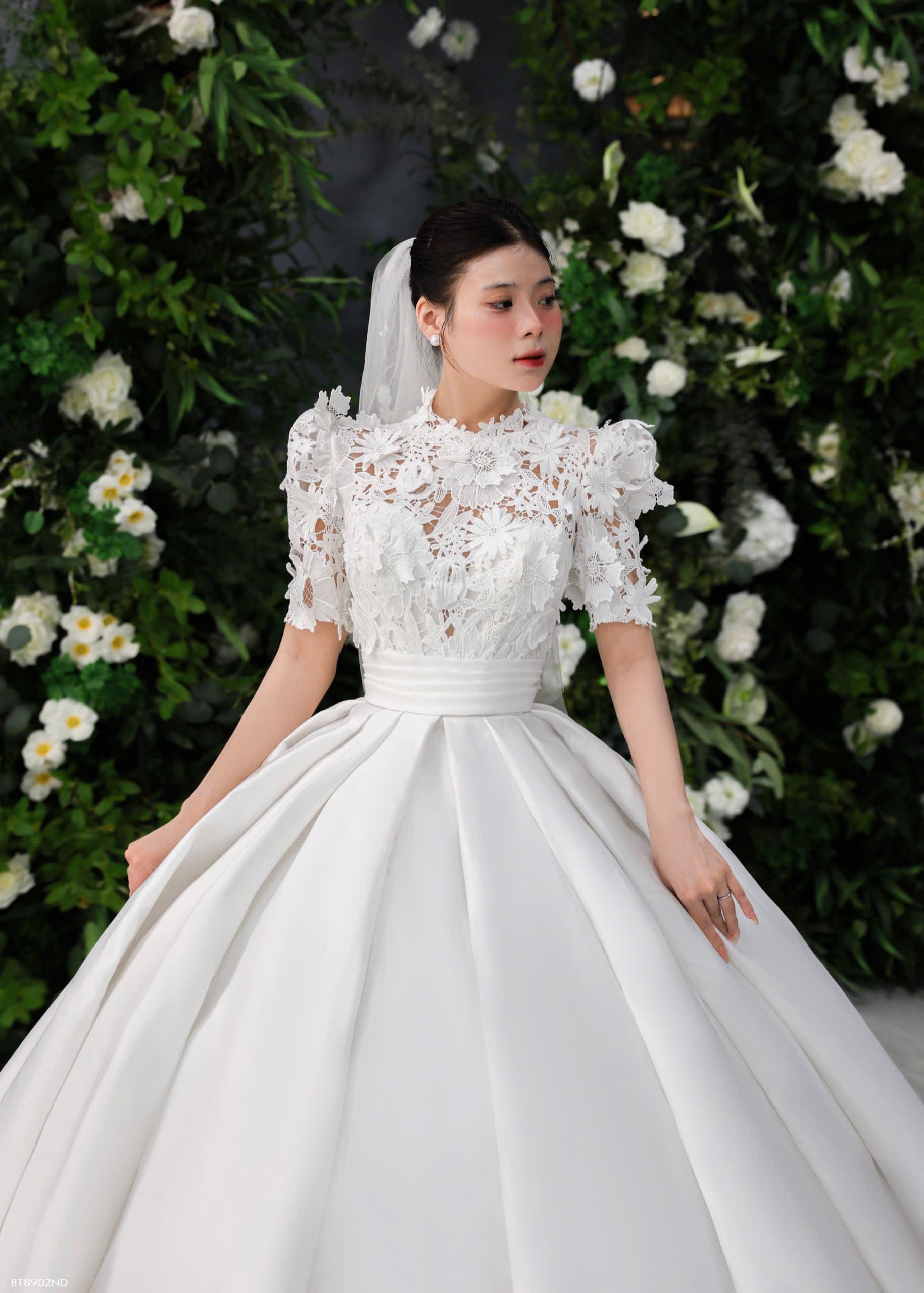 VÁY CƯỚI LÀM LỄ THÊU HOA CỔ CAO